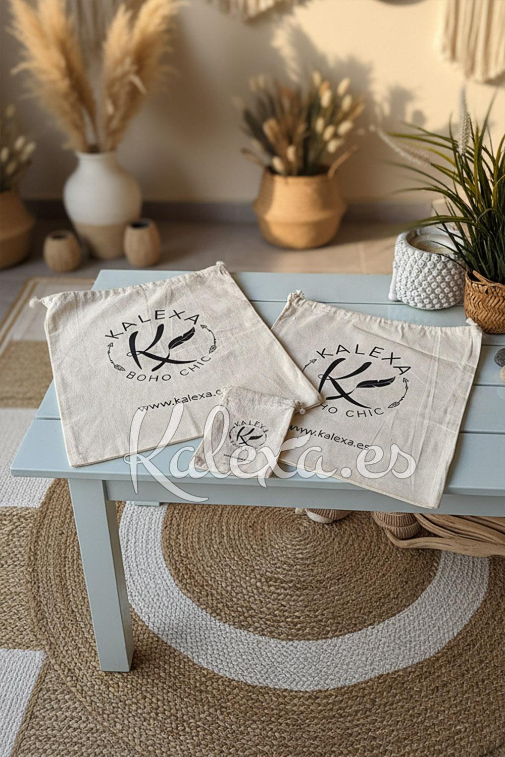 Natürliche Baumwolltasche mit dem Kalexa-Logo, ideal zum Aufbewahren von Schmuck oder kleinen Accessoires. Das Design mit verstellbaren seitlichen Schnüren ermöglicht ein einfaches Verschließen und schützt deine Stücke mit Charme.