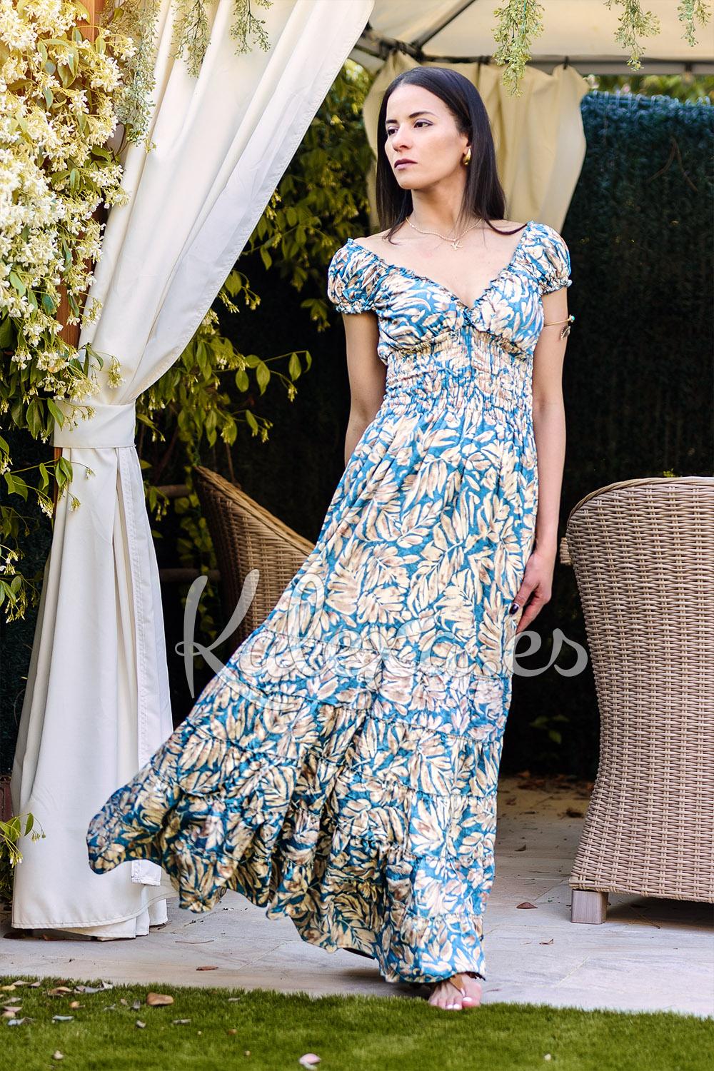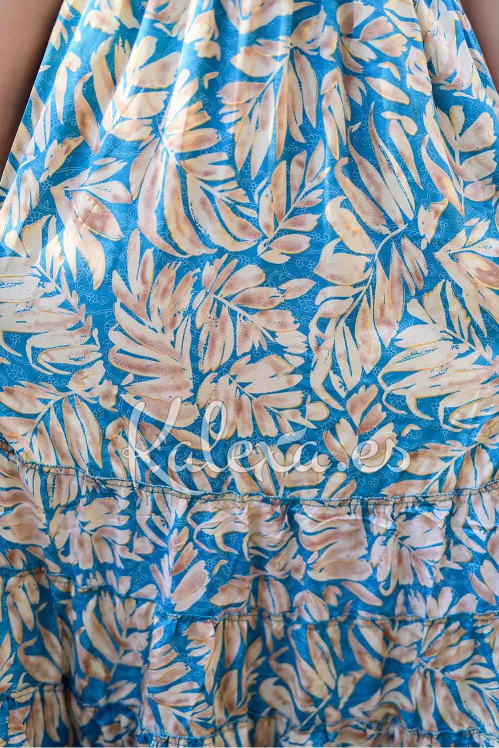 Boho Chic Kleid mit goldenen Details im Muster. Sein geraffter Bienenwaben-Taillenbund passt sich sanft an und betont die Silhouette auf bequeme Weise. Der überkreuzte V-Ausschnitt ist verstellbar, was Vielseitigkeit und einen femininen Touch bringt. Fröhlich, lebendig und voller Leben strahlt dieses Kleid Farbe und gute Energie bei jeder Bewegung aus. Hergestellt in Indien mit Liebe und aus 70% Seide, 30% Viskose.
