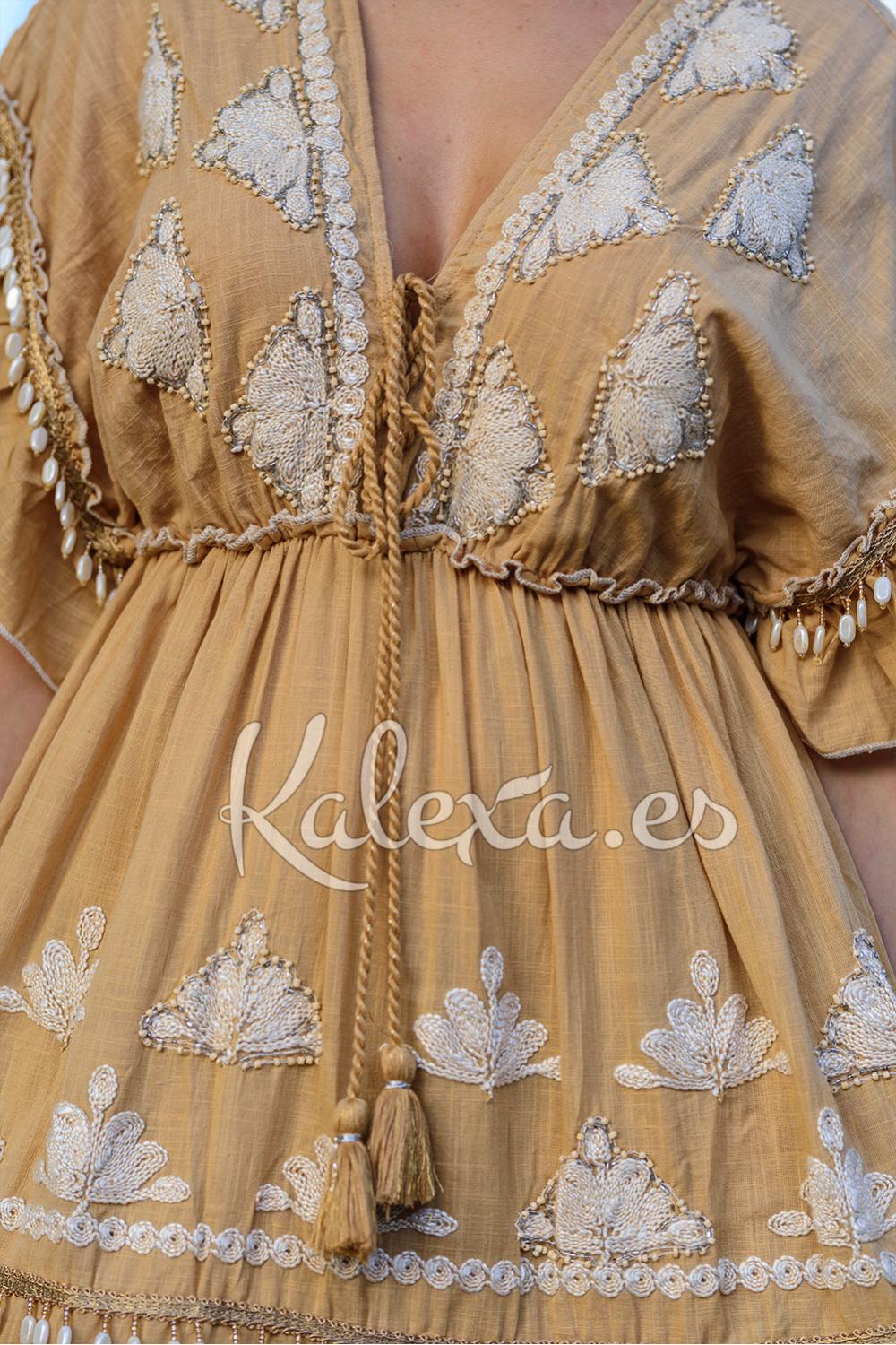 Dieses Boho Chic Kleid besticht mit seinem V-Ausschnitt und den zarten Volantärmeln, die Bewegung und eine unverkennbar feminine Note verleihen. Die Stickereien und Applikationen in passenden Farben heben sein Design mit einem handgearbeiteten und harmonischen Touch hervor.