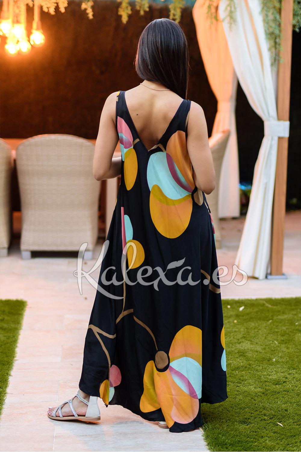 Dieses ärmellose Boho-Kleid überzeugt durch seine weiche, fließende Satin-Oberfläche und sein farbenfrohes abstraktes Muster.