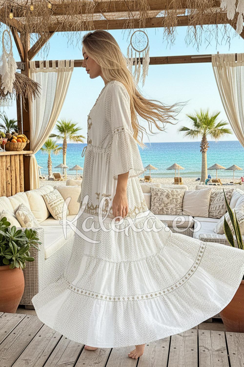 Weiches Baumwollkleid mit einer subtilen goldenen Prägung, die Licht und Eleganz verleiht. Es hat einen Mao-Kragen mit Clipverschluss und handgefertigte Verzierungen mit Stickereien, Perlen und kleinen Spiegeln, die seinen bohemischen Charme unterstreichen.