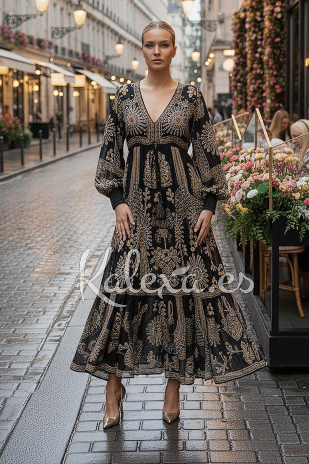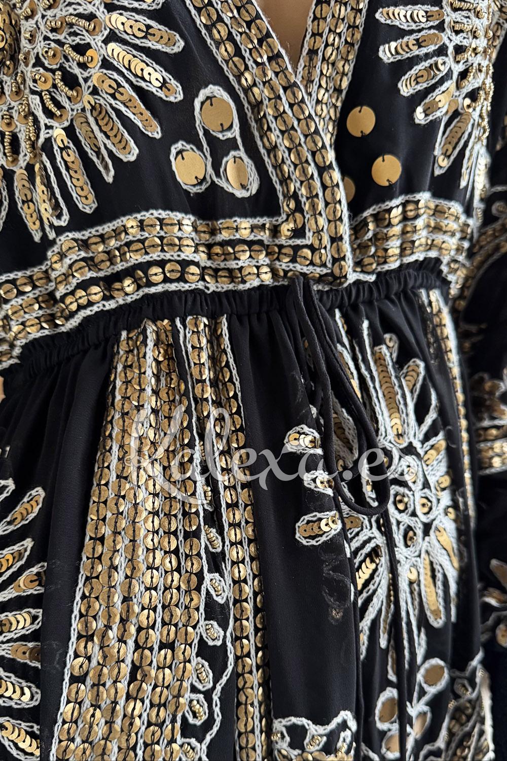 Schwarzes Boho-Chiffonkleid mit goldenen Stickereien und Pailletten