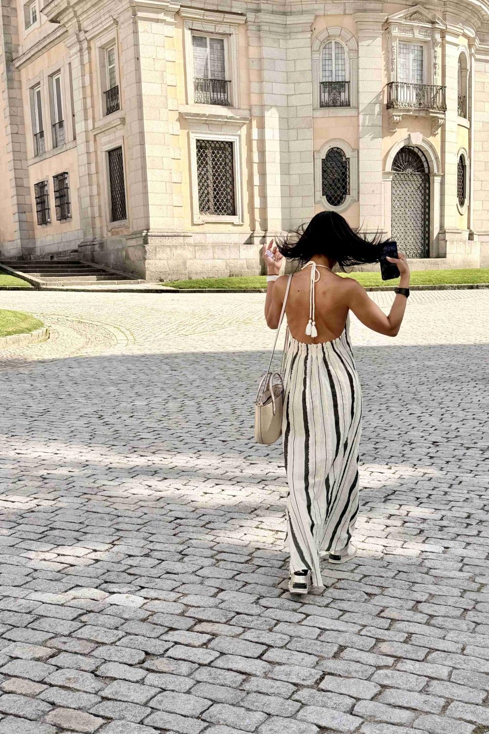 Boho-Chic Maxikleid mit fließendem Schnitt, V-Ausschnitt und offenem Rücken. Das Design mit verstellbaren Trägern und elastischem Band sorgt für Komfort und passt sich natürlich dem Körper an. Der Frontschlitz und der leichte Stoff mit ausgefranstem Effekt verleihen ihm einen lässigen und besonderen Look.