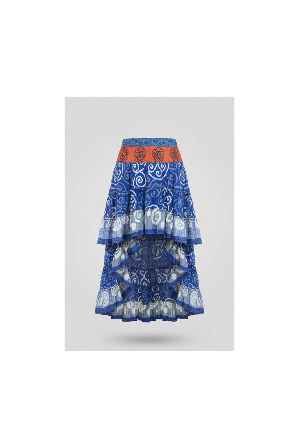 Asymmetrischer Boho-Rock aus Seide, leicht und mit einem spektakulären fließenden Fall. Jedes Muster ist einzigartig und es gibt nur ein Stück pro Design, was es zu einem exklusiven und besonderen Kleidungsstück macht.