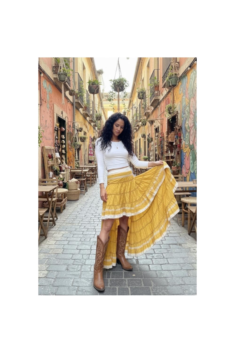 Asymmetrischer Boho-Rock aus Seide, leicht und mit einem spektakulären fließenden Fall. Jedes Muster ist einzigartig und es gibt nur ein Stück pro Design, was es zu einem exklusiven und besonderen Kleidungsstück macht.
