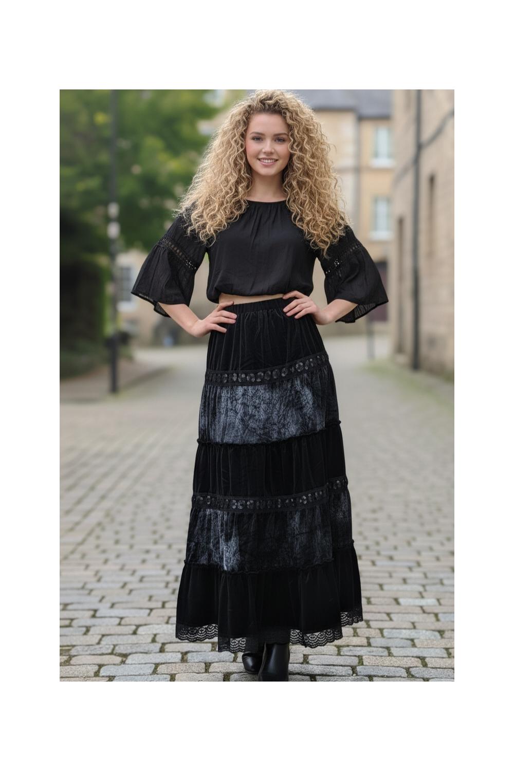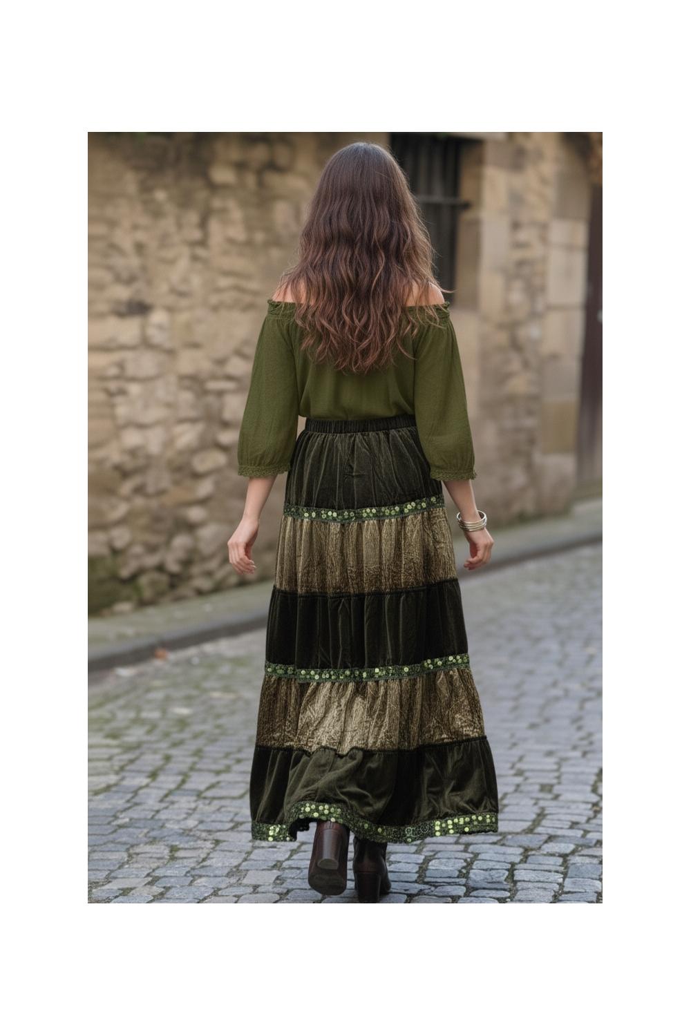 Langer, bohemischer Rock mit einem Design aus Panels, das bei jedem Schritt Bewegung und Charakter verleiht. Der samtige Stoff sorgt für ein warmes und besonderes Finish, ideal für Übergangslooks.