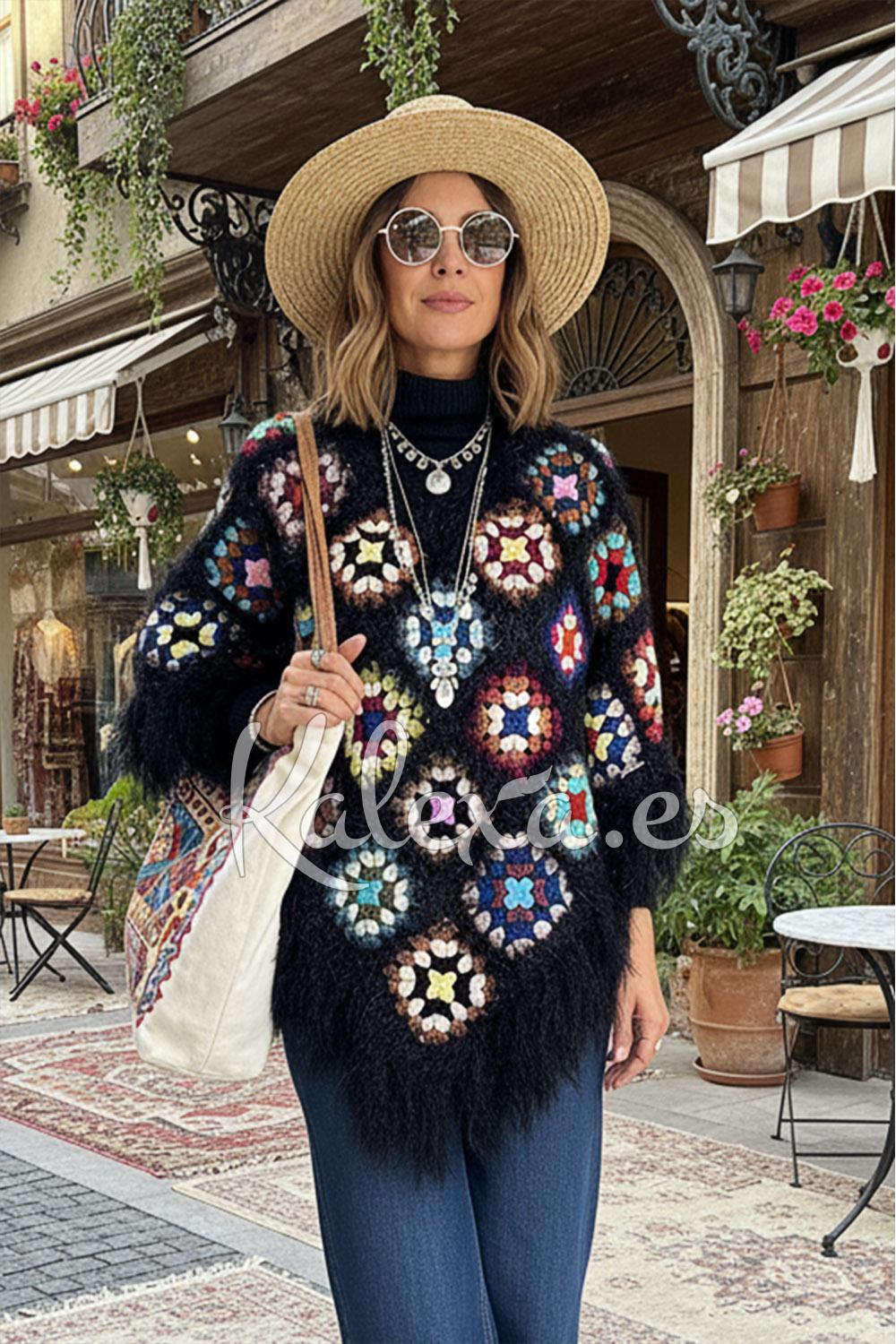 Handgefertigter Häkelpullover mit einem Design voller Textur und Bewegung. Die Fransen am Saum und die dezenten glitzernden Akzente verleihen ihm einen originellen und leuchtenden Touch, während sein bohemischer und freier Charakter erhalten bleibt.