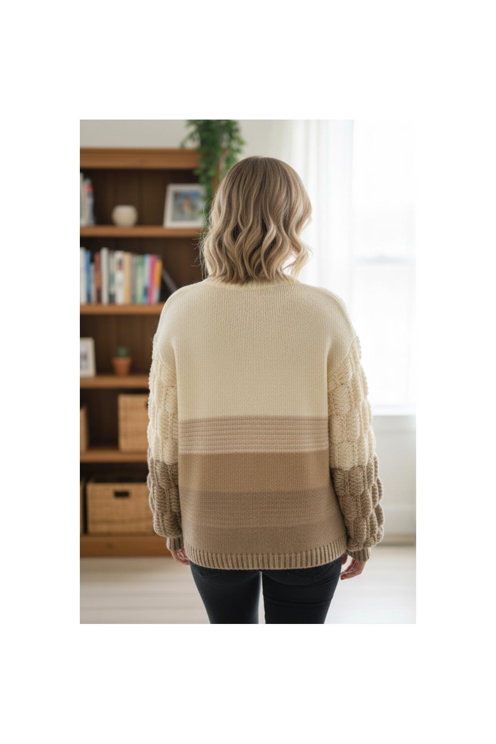 Weiches Jersey in neutralen Farbtönen, mit Streifendesign und Ballonärmeln, die Textur und Stil verleihen. Bequem, warm und vielseitig, ideal für lässige Looks mit einem eleganten Touch im Alltag. 100% Polyester.