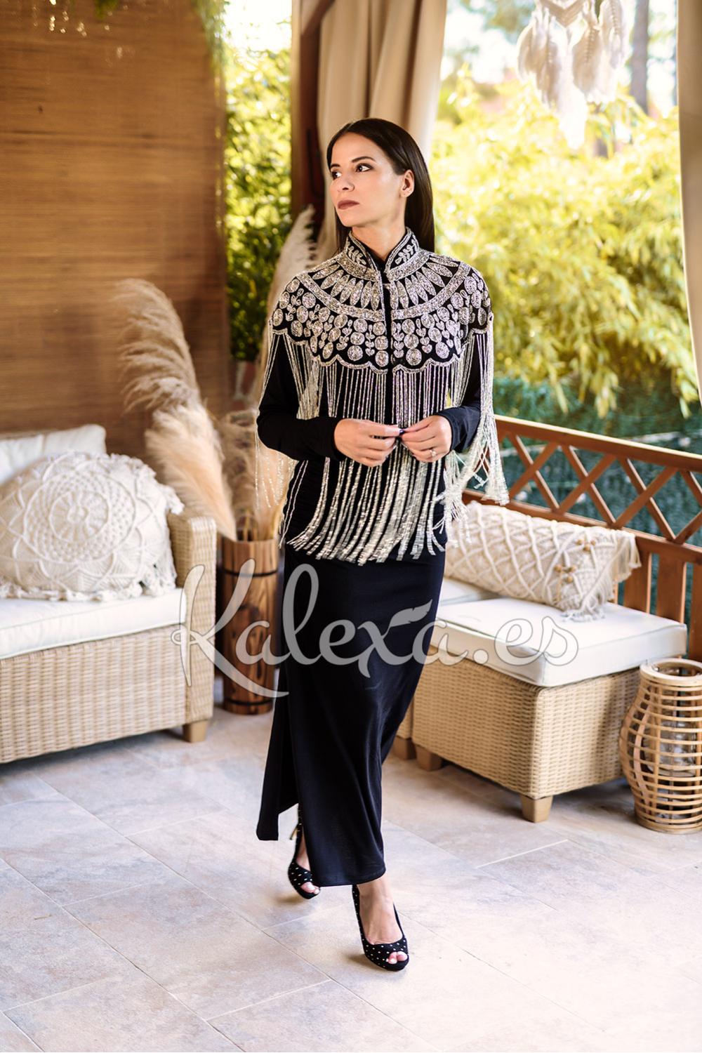 Handgefertigter Boho-Schal mit exquisiten Strasssteinen, zarten Stickereien und Applikationen aus Perlen und Pailletten, die einen eleganten Glitzereffekt erzeugen. Die tränenförmigen Fransen verleihen Bewegung und einen Hauch von Boho-Stil. Entworfen mit einem gepolsterten Rundhalsausschnitt und einem vielseitigen Verschluss, der es ermöglicht, ihn entweder als Poncho oder als Schal zu tragen, je nach gewünschtem Stil. Mit einer Oversize-Silhouette ist es das perfekte Kleidungsstück, um jeden Look mit einem Hauch von Eleganz und Einzigartigkeit zu vervollständigen. Handgefertigt und mit Liebe in Indien hergestellt.