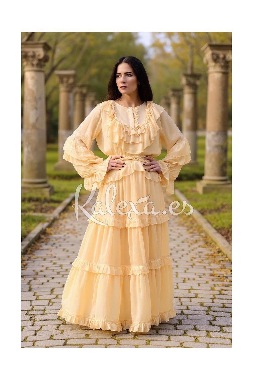 Boho chic dress from the exclusive Parisian brand Diamond for Eden, the design, the drape, and the fabric are in perfect harmony as in all their creations. The dress is spectacular, with a closed neck with buttons and fasteners that can be opened, and it has Victorian-style ruffles matching the sleeves and the skirt. It has a stretchy inner lining. The fabric falls elegantly and spectacularly. The sleeves feature beautiful ruffles. It comes with a braided belt that can be worn in various positions. Simply a work of art, this dress is original and magnificent, with a majestic drape of almost 6 meters of fabric. A garment that leaves no one indifferent. Designed in Paris and made in India with love, 100% viscose.