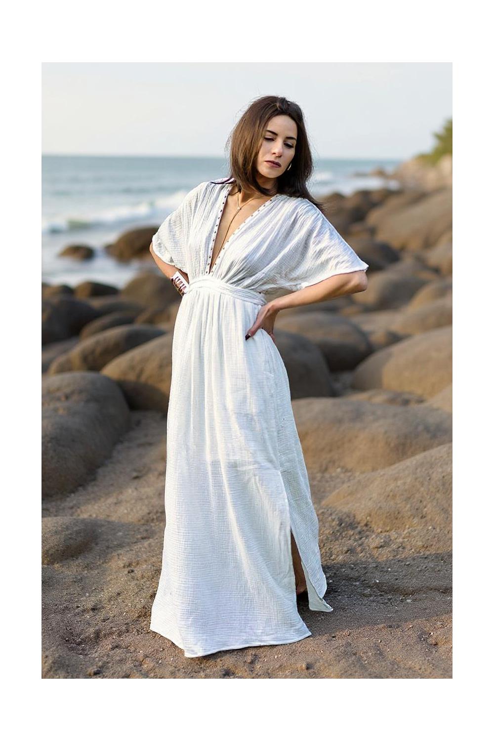 Boho chic dress with a Greek style, braids at the waist, and a neckline with wooden bead appliques, featuring matching braided shoulders. It has a V-neck and braided straps for adjusting at the back. The dress has side openings and pockets, with an elastic waist at the back. An original, sensual, and versatile model that allows you to express your empowered and bohemian side. Made with love and 100% cotton.
