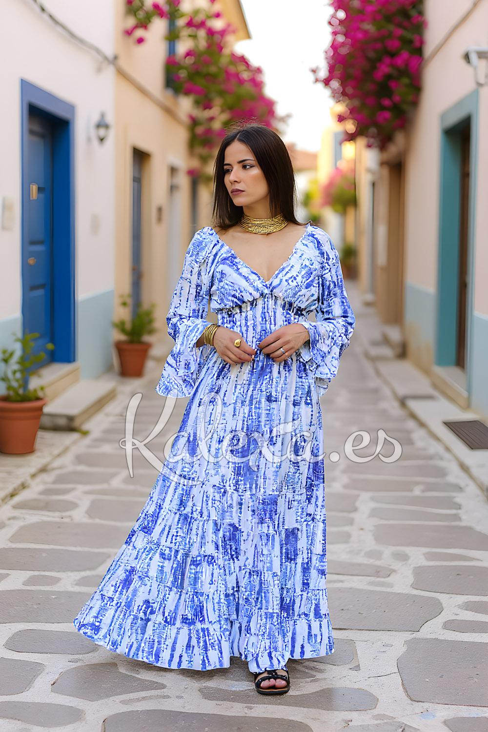 This boho chic dress captivates with its painted-style print enhanced by subtle shiny threads, adding a touch of light and elegance. The elastic honeycomb waist adapts softly, while the V-neck crossover and adjustable sleeves provide a comfortable and feminine fit.