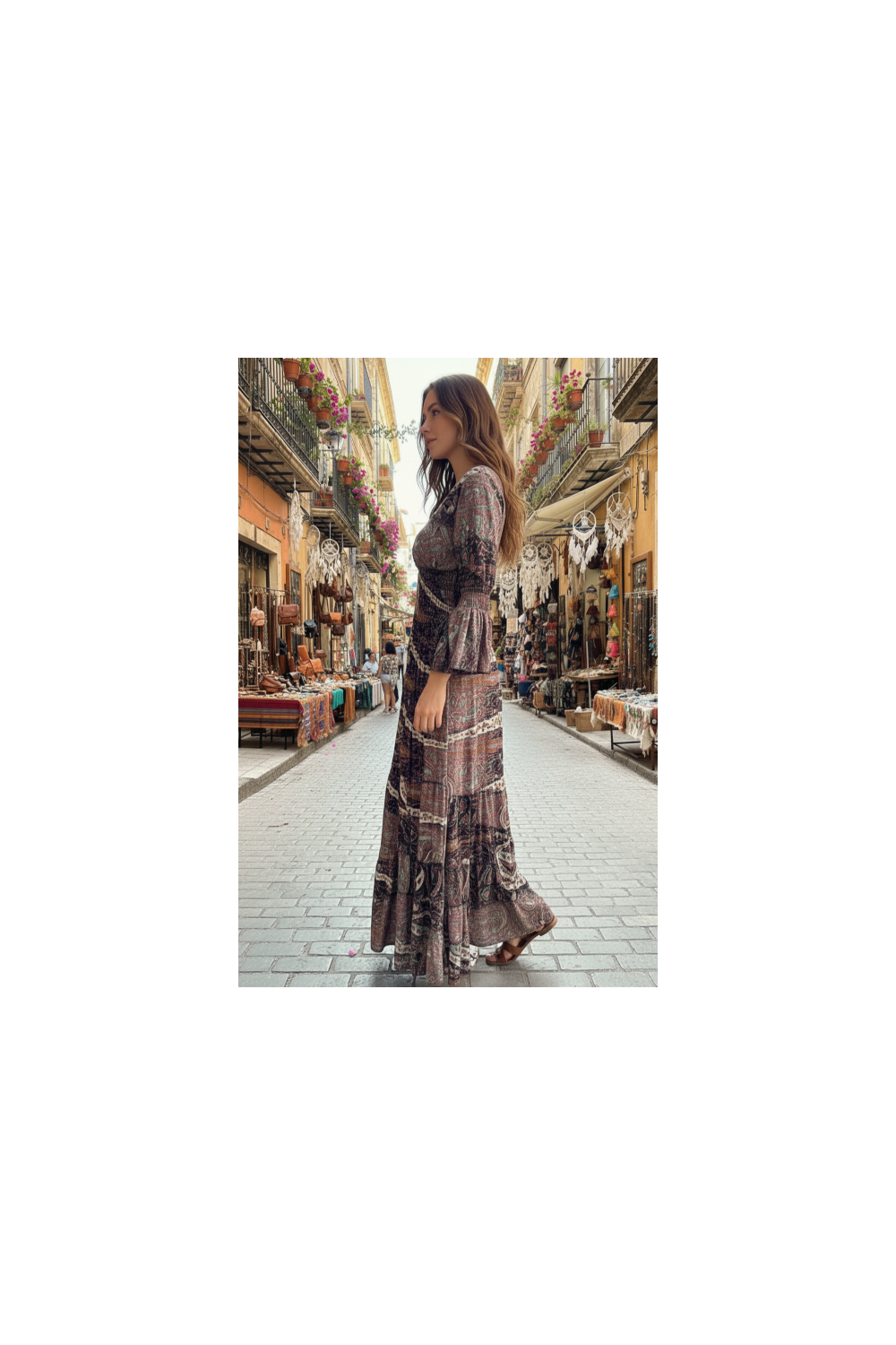 A versatile and feminine garment, ideal for both everyday wear and special occasions. Its lightweight fabric offers a fluid drape and a sophisticated bohemian style.