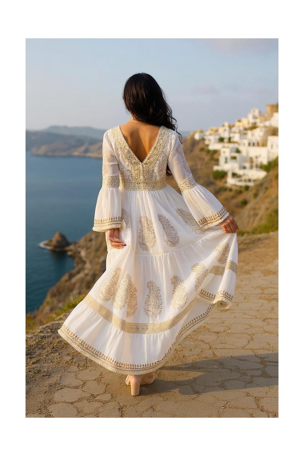 Ibizan guest dress, has V-neckline with crochet lace to match the waistband, the print has a golden engraving and appliques of tiny beads and mirrors. The waistband is elasticized and has a drawstring with beaded detail. The sleeves and hem are finished with tiny bangs. The drape is a show-stopper with about 4 meters of crochet fabric to match the bangs. It has inner lining. Undoubtedly an elegant, romantic and very original dress. Made in India with love and 100% cotton.