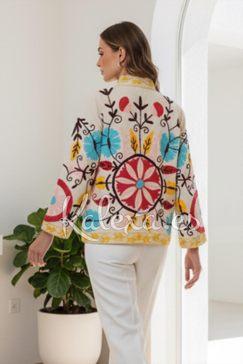Bohemian-style jacket made of 100% cotton, decorated with hand-embroidered designs in vibrant tones such as yellow, turquoise, pink, and brown. Its light background enhances each floral and organic motif, creating a luminous, cheerful piece full of personality.