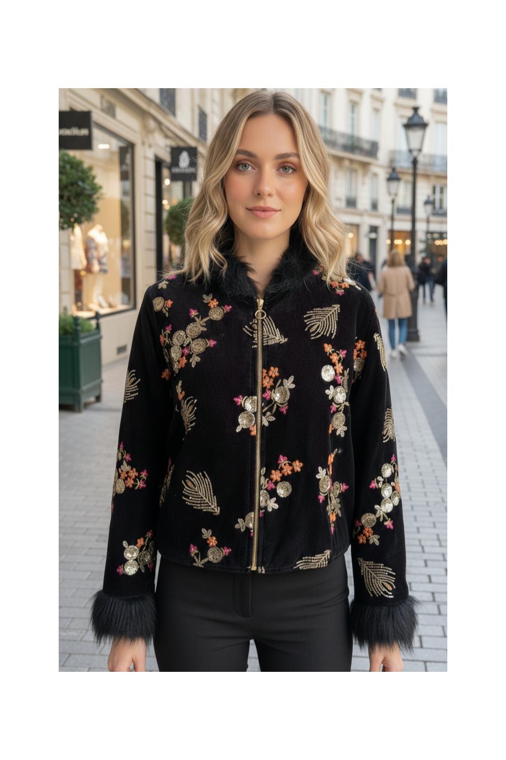 Elegant boho jacket in black velvet, with floral embroidery in gold, pink, and orange tones that bring light and sophistication. Features a front zipper, soft collar with faux fur effect, and cuffs with fur finish, giving it a chic and special touch.