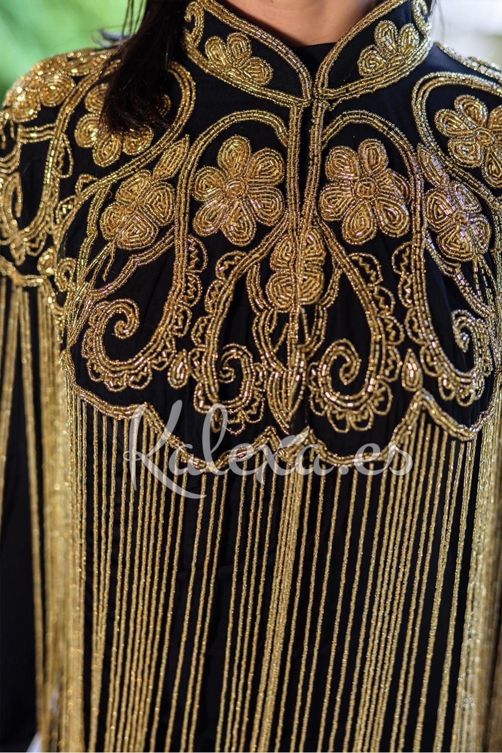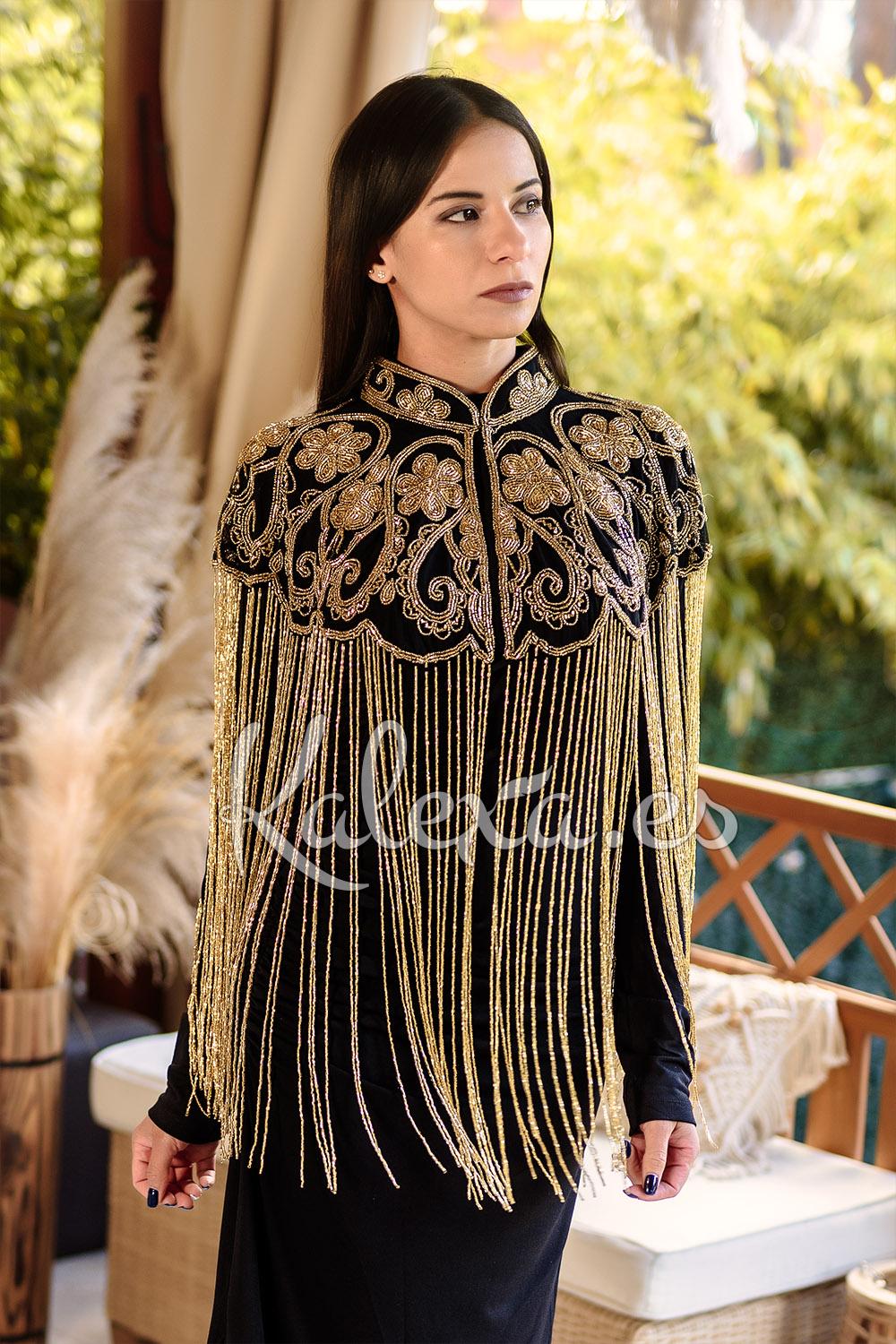 Capa de pedrería con bordados y apliques de cuentas y lentejuelas, con flecos en lágrimas. LLeva cuello redondo alcolchado y el cierre con abertura que se puede poner en ambas direcciones (poncho o capa). Es una prenda ideal para transformar cualquier look en uno mucho más arreglado. Hecha a mano en la India con amor. Over size