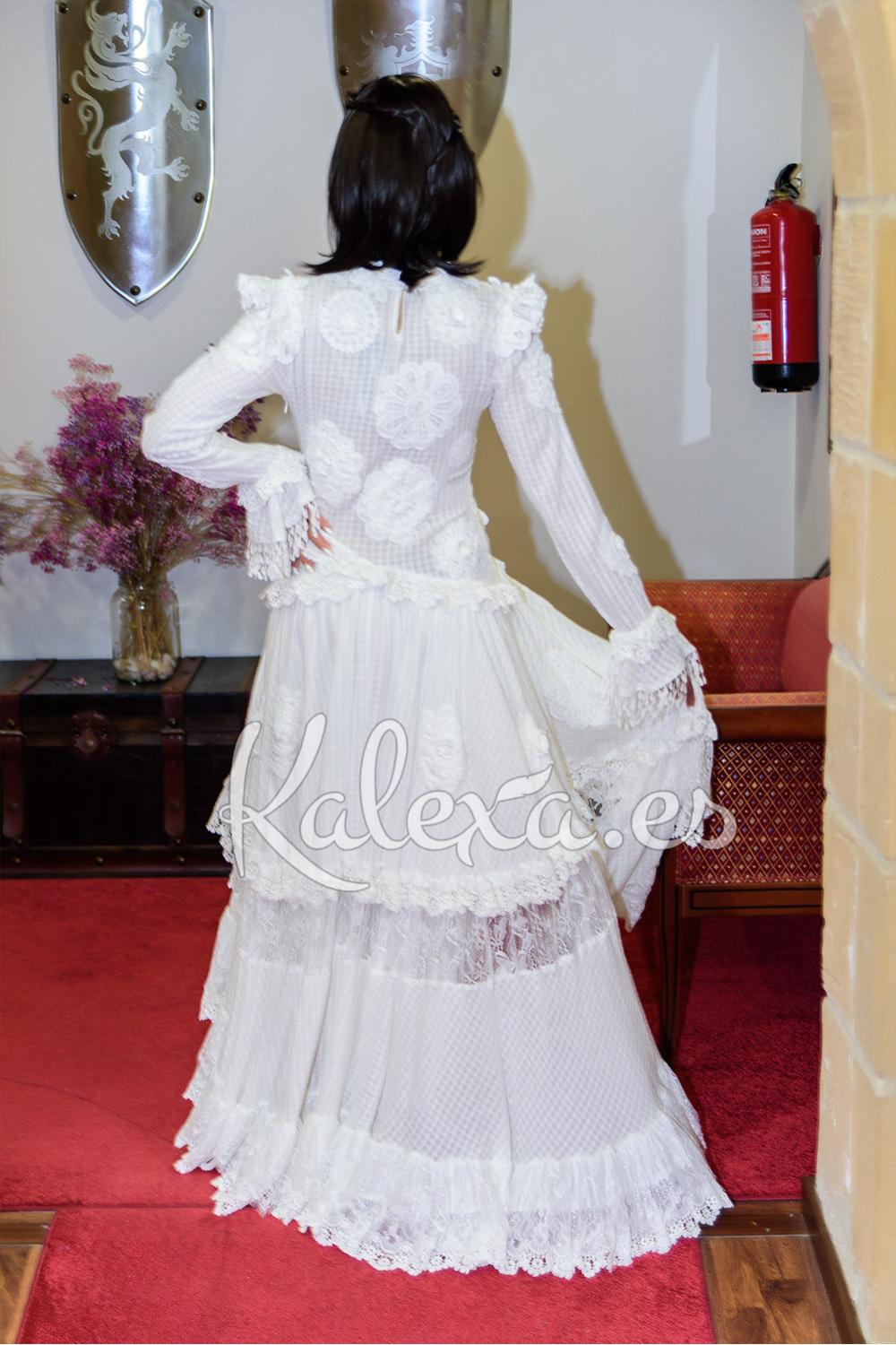 Descubre un vestido de novia bohemio y diferente, diseñado para mujeres auténticas y con personalidad. Este modelo destaca por su bajo asimétrico, que aporta un movimiento dinámico y un toque chic y original. Las mangas largas con puños acampanados evocan un estilo romántico y etéreo, mientras que la cremallera lateral garantiza un ajuste cómodo y favorecedor. El cuerpo del vestido presenta delicados apliques de encaje en relieve con formas florales, aportando textura y sofisticación. Su cuello cerrado tipo victoriano le da un aire señorial y moderno, perfecto para novias que desean romper moldes sin perder elegancia.