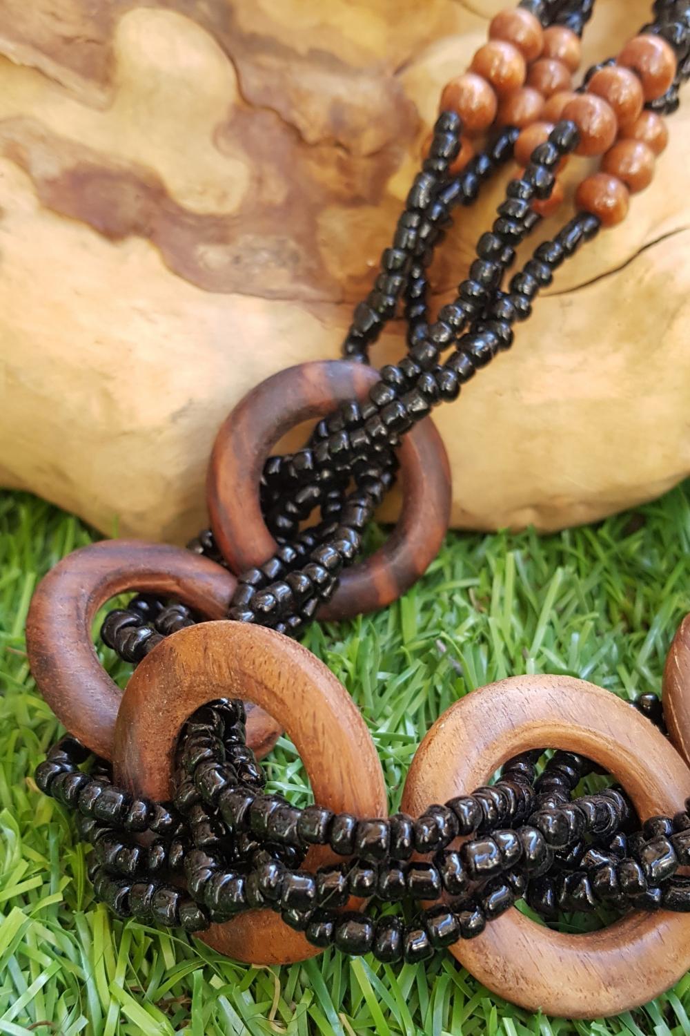 Collar con aros de madera tallada y cierre en madera. Hecho a mano, importado desde Bali por comercio justo.