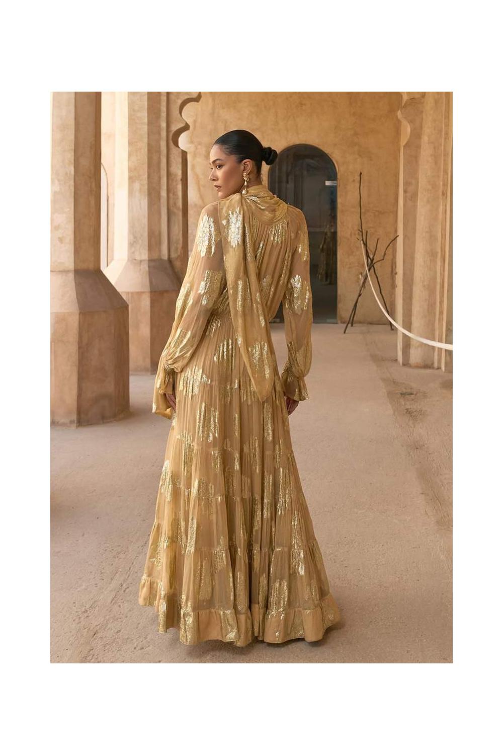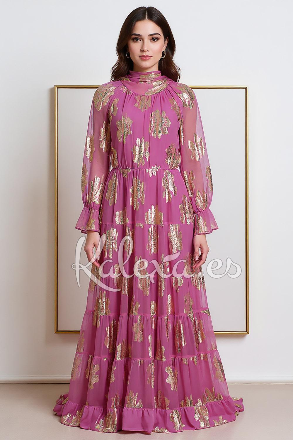 Vestido bohemio de invitada con un diseño estampado lleno de encanto, realzado por hilos de lúrex que aportan un brillo sutil y luminoso al moverse. Confeccionado en un tejido ligero y vaporoso, envuelve la figura con una silueta fluida y elegante, perfecta para brillar en eventos tanto de día como de noche. Su espectacular vuelo, con más de 7 metros de tela, aporta movimiento, presencia y un aire sofisticado que no pasa desapercibido. Con cintura elástica y cuello estilo fular, es ideal para invitadas que buscan un look boho con un toque de distinción. Hecho en la India con amor y 100% viscosa, Forro, 100% algodón.