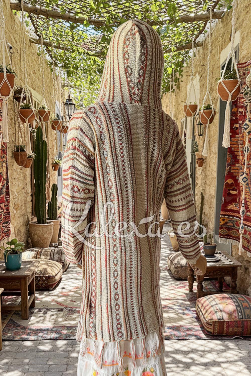 El otoño nos enseña la belleza de dejar ir, y este cárdigan rinde homenaje a esa magia. Su tejido multicolor, lleno de matices cálidos, evoca un auténtico paisaje otoñal. Con capucha y flecos en el bajo, combina estilo, comodidad y espíritu libre.