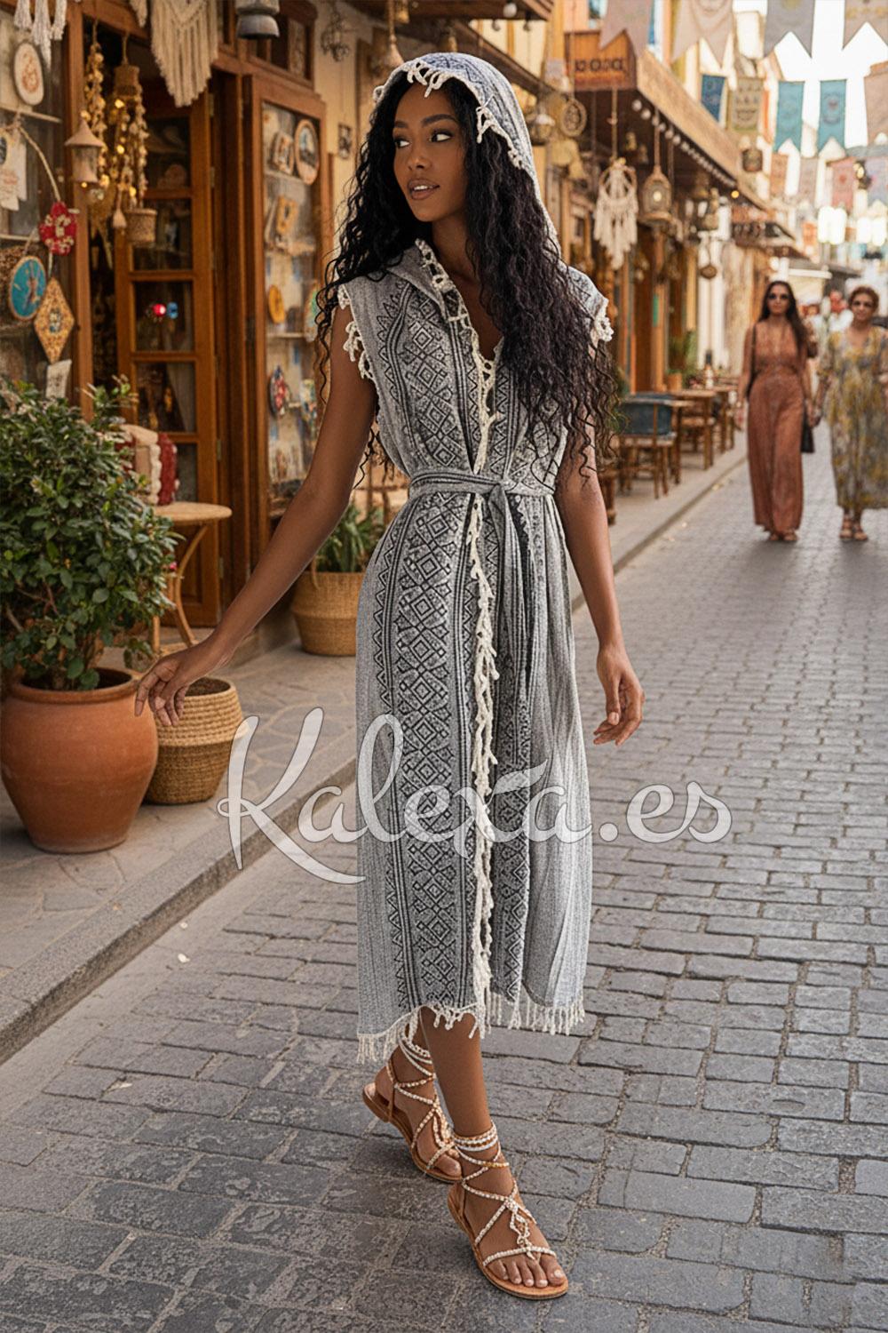 Chaleco sin mangas de inspiración étnica, confeccionado en algodón estampado con motivos boho. Lleva capucha, bolsillos laterales y un cinturón ajustable que permite definir la silueta con estilo.