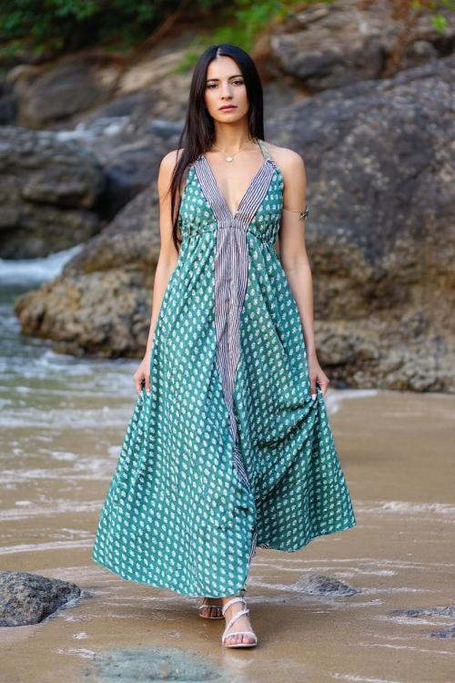 Vestido Bohemio de estampado étnico, lleva escote en V con tirante ajustable y adaptable al pecho, en la parte trasera también lleva un cordón ajustable que estiliza la espalda. Elegante, favorecedor y sensual, así es este vestido. Hecho en la India con amor y 100% algodón.
