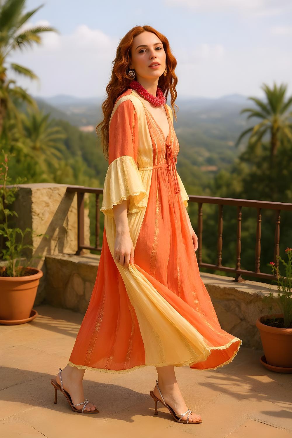 Este vestido boho es una joya de elegancia relajada y detalles artesanales. Su cuello en V y cintura elástica abrazan la figura con suavidad, mientras que los tirantes ajustables en el escote permiten un calce perfecto.