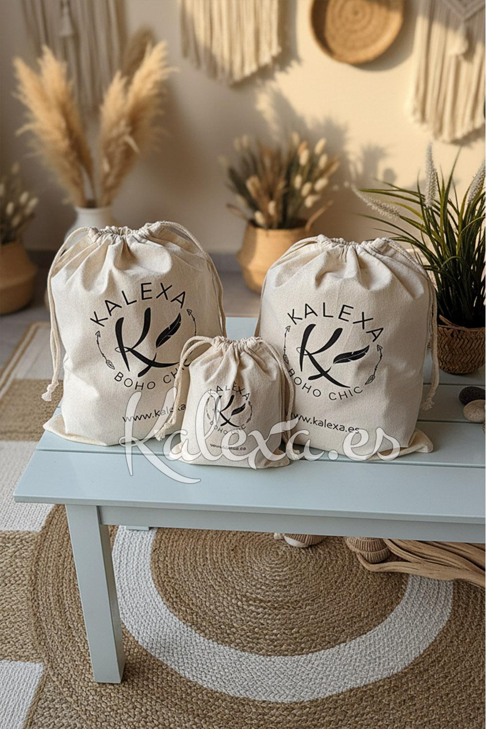 Bolsa de algodón natural con el logotipo de Kalexa, ideal para guardar prendas, complementos o utilizar como envoltorio de regalo sostenible. Su cierre con cordones laterales permite un ajuste cómodo y seguro, manteniendo su encanto artesanal.