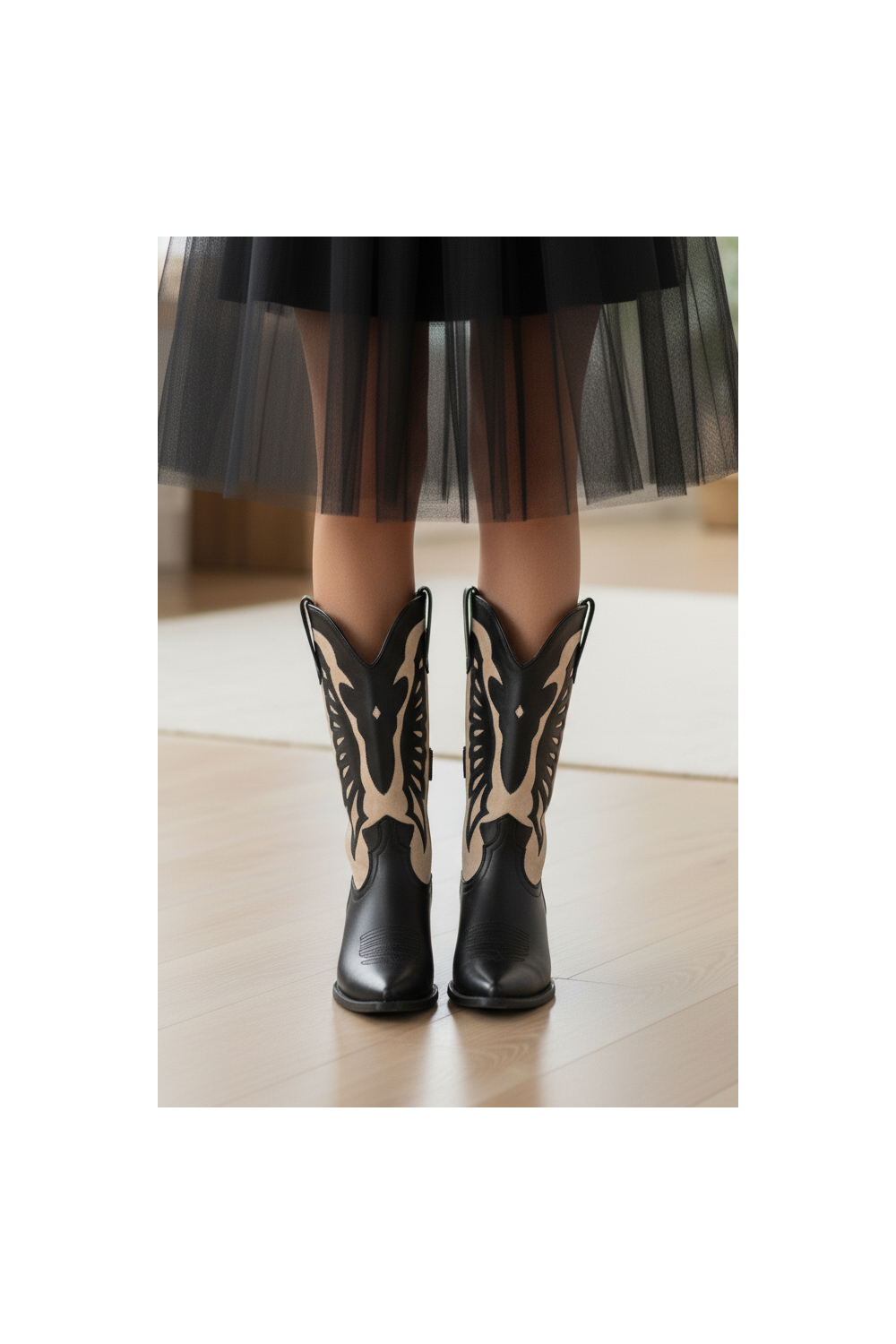 Botas Boho cawboy de estilo texano, con una caña preciosa con colores en contraste. Este estilo nos hace lucir unas piernas más bonitas y estilizadas, llevan cremallera lateral, muy prácticas a la hora de combinar porque van con todo... Simplemente ideales!  Hechas con amor y cuero vegano.