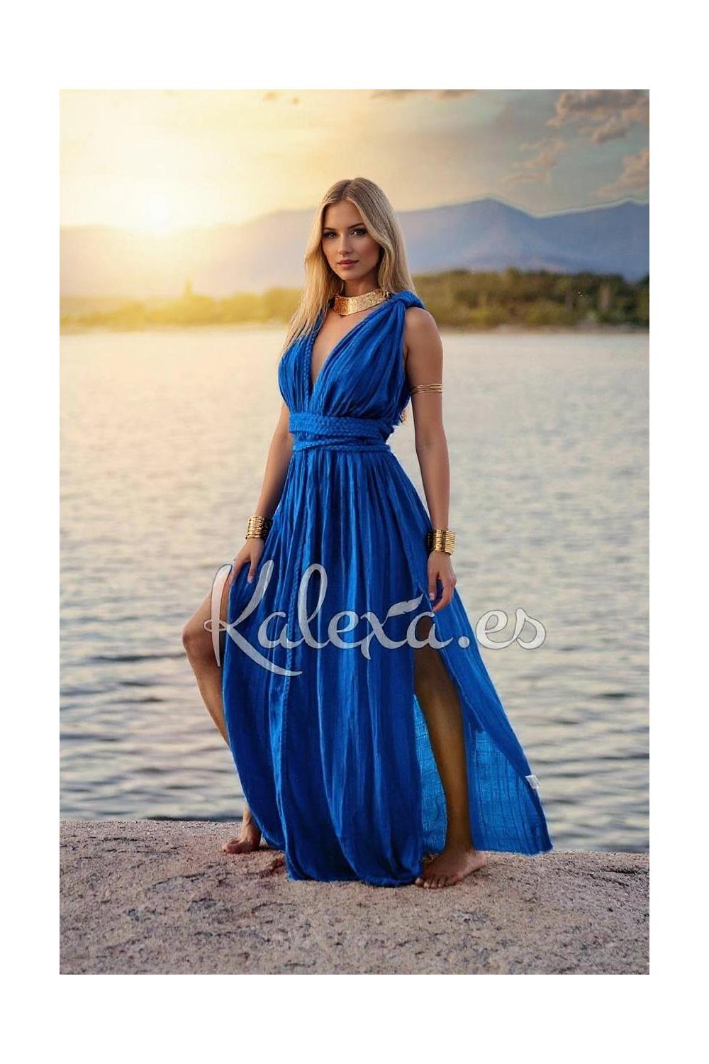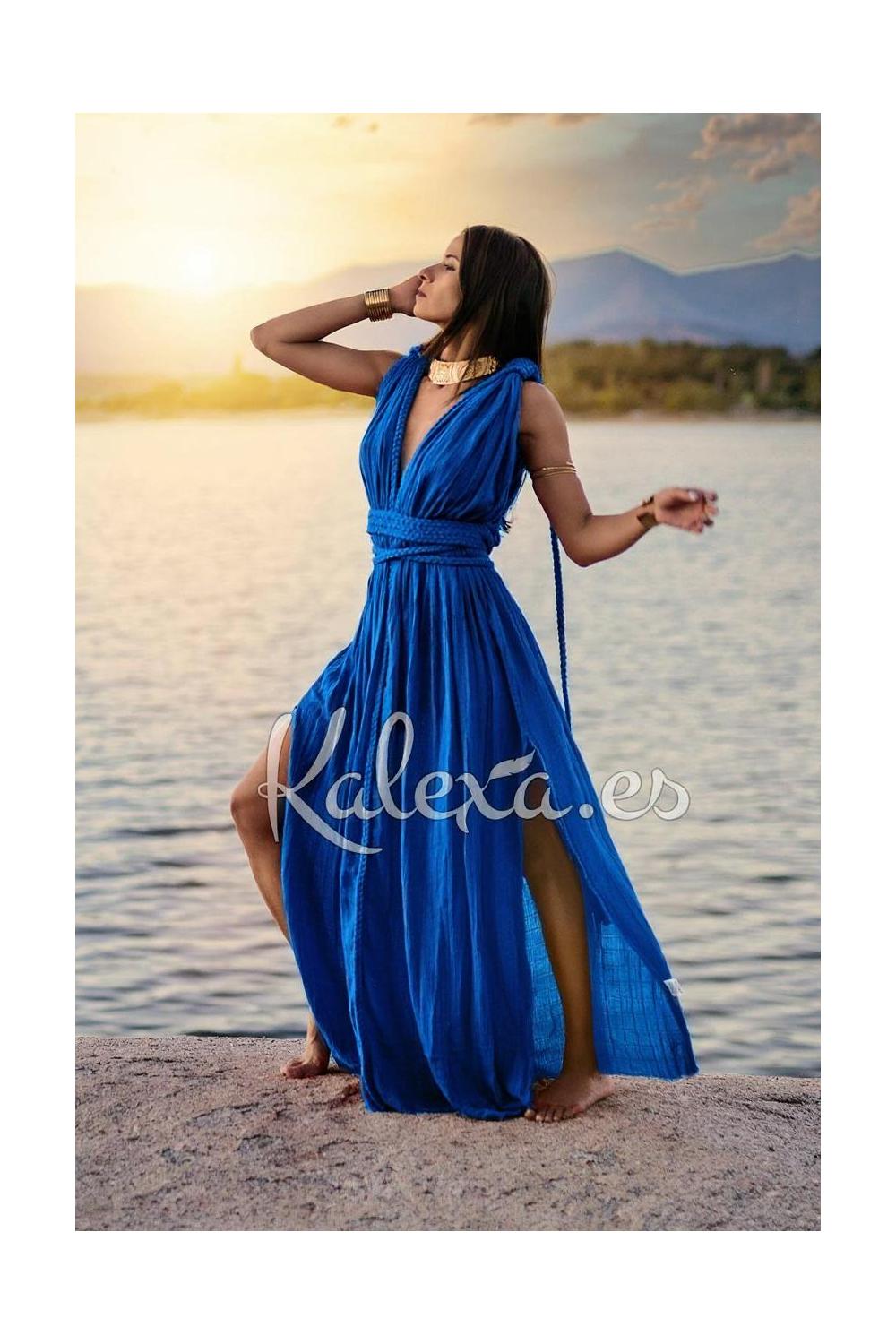 Vestido Boho Chic de estilo griego con tranzado en los hombros, lleva trenzas como cinturón que se pueden colocar es distintas posiciones. La espalda es en V, y lleva aberturas en la parte frontal. Simplemente una prenda original y muy sexy, con la que darás rienda suelta a la diosa que llevas dentro. Hecho en la India con amor y 100% algodón. El tejido es delicado  y se debe tener especial cuidado de no engancharlo.