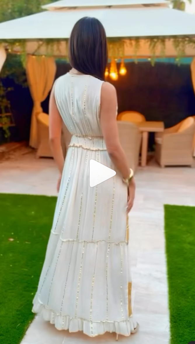 Vestido Boho con escote en V y bordados de cuentas y perlas, tanto en el escote como en la parte delantera de la falda, la cintura es elástica. El tejido tiene destellos en hiloss dorado en contraste, y la caída es favorecedora y elegante. Tiene forro interior. Hecho en la India con amor y 100% viscosa.