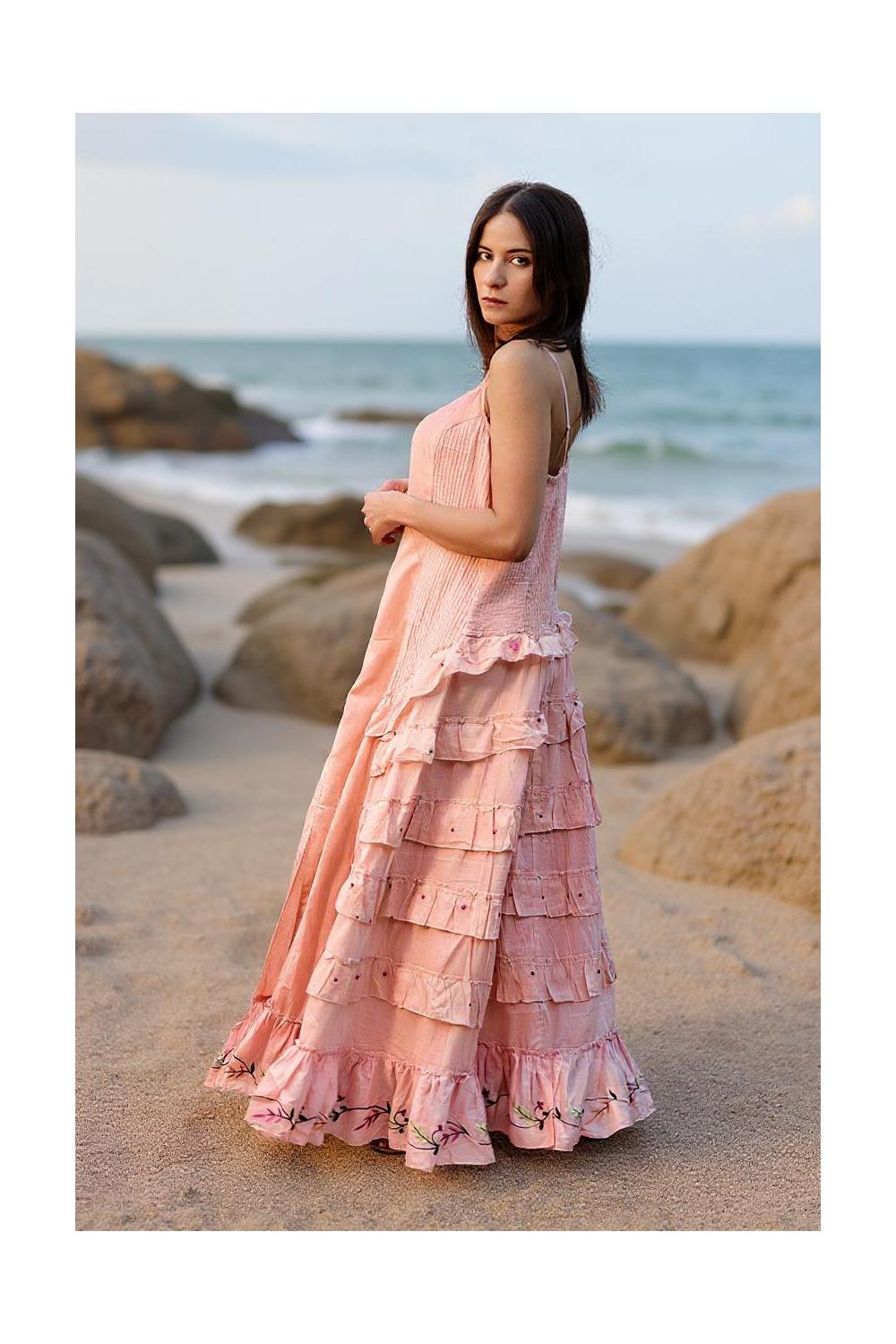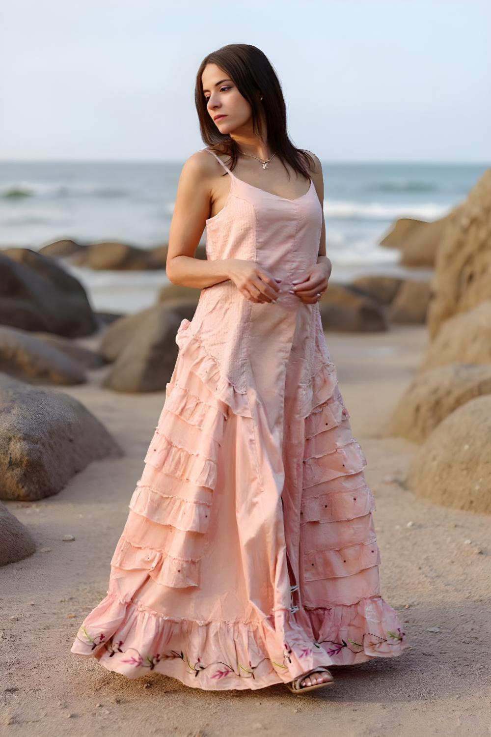 Este vestido boho chic es una auténtica joya textil. Confeccionado en algodón suave y natural, fluye con un vuelo vaporoso salpicado de volantes bordados a mano, que aportan textura, movimiento y un aire romántico irresistible.