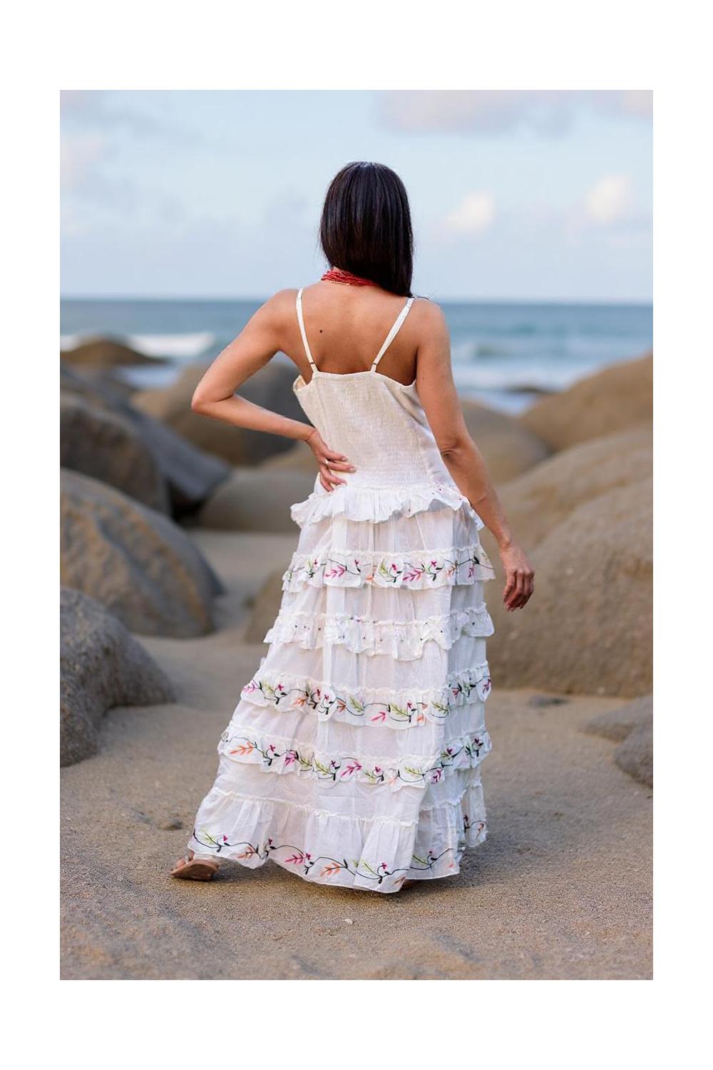 Este vestido boho chic es una auténtica joya textil. Confeccionado en algodón suave y natural, fluye con un vuelo vaporoso salpicado de volantes bordados a mano, que aportan textura, movimiento y un aire romántico irresistible.