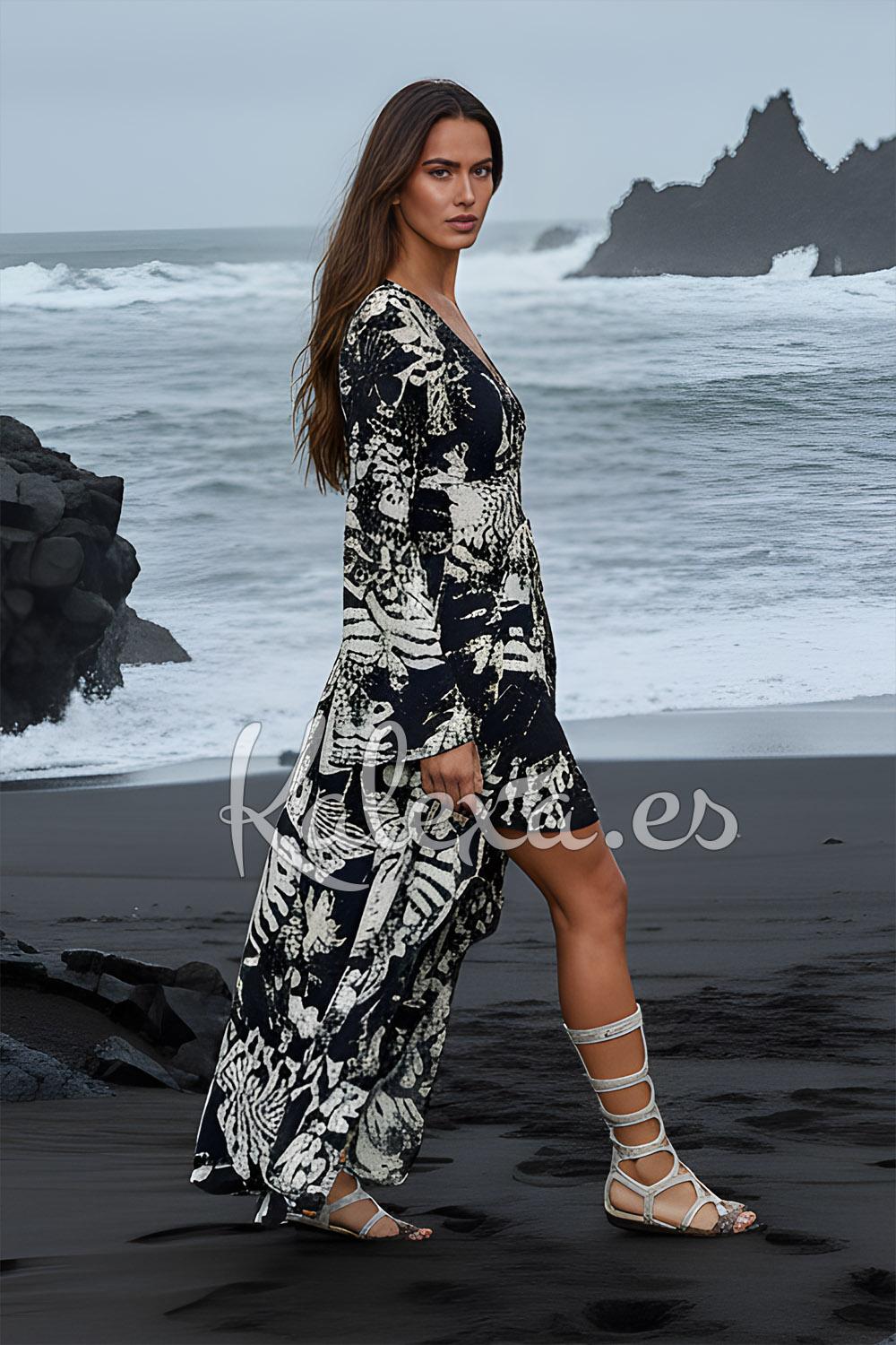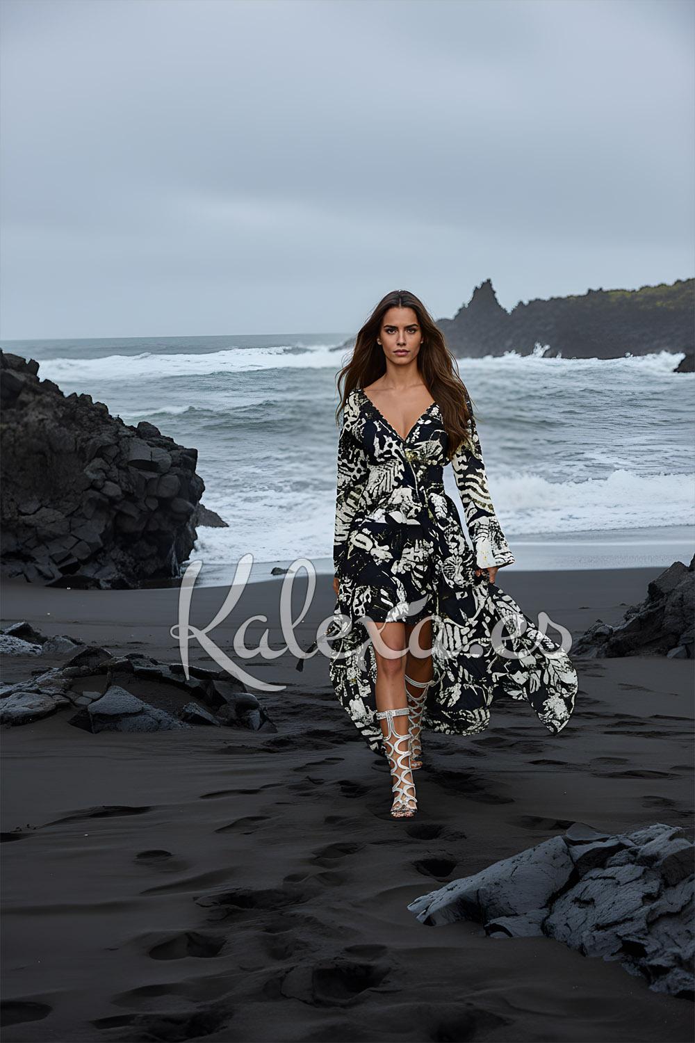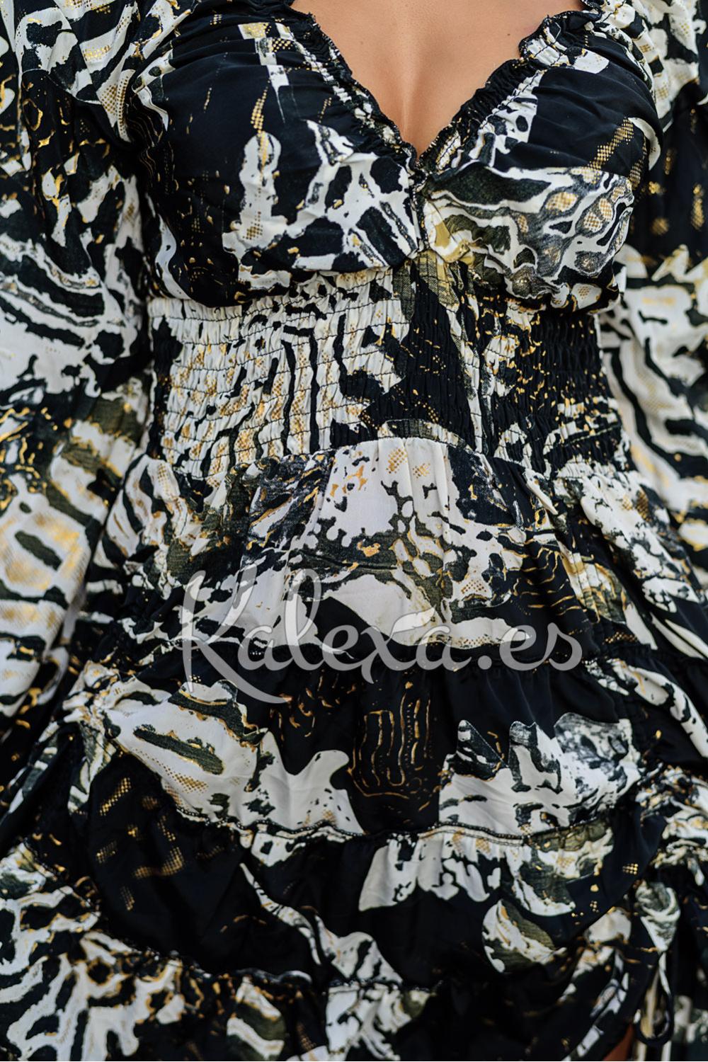 Su estampado en tonos oscuros de blanco y negro, realzado con delicados toques dorados, refleja elegancia, fuerza y sofisticación. El ligero brillo del tejido aporta un aire chic y contemporáneo, manteniendo intacta su esencia bohemia y orgánica.