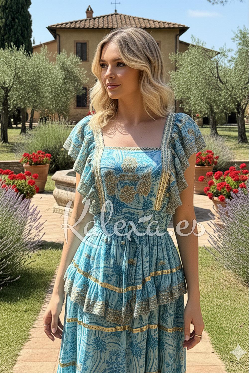 La cintura elástica asegura comodidad y realza la silueta con naturalidad, mientras su aire boho chic lo convierte en una pieza original, elegante y perfecta para ocasiones especiales. Hecho en la India con amor y 100% algodón.