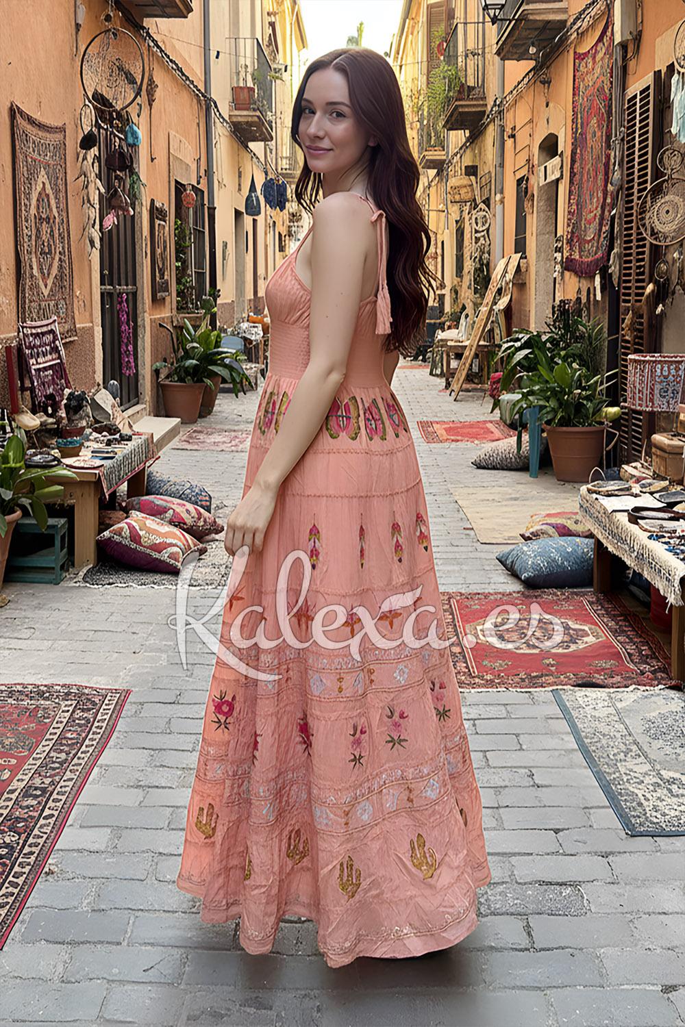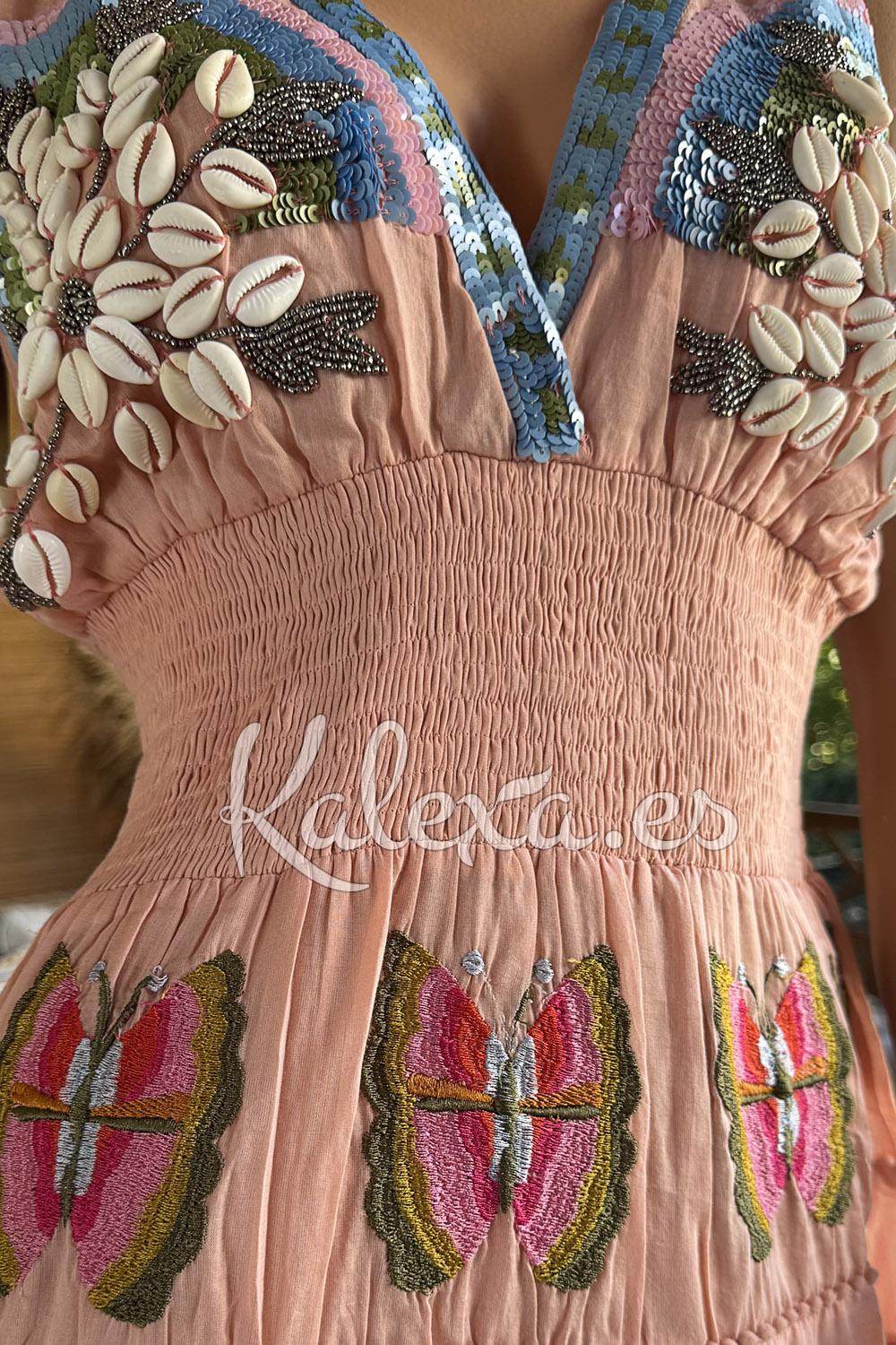 Vestido sin mangas con tirantes ajustables en los hombros y bordados de inspiración mexicana en todo el tejido. El pecho luce apliques de caracolas y cuentas cosidas a mano, que aportan un toque artesanal y auténtico.