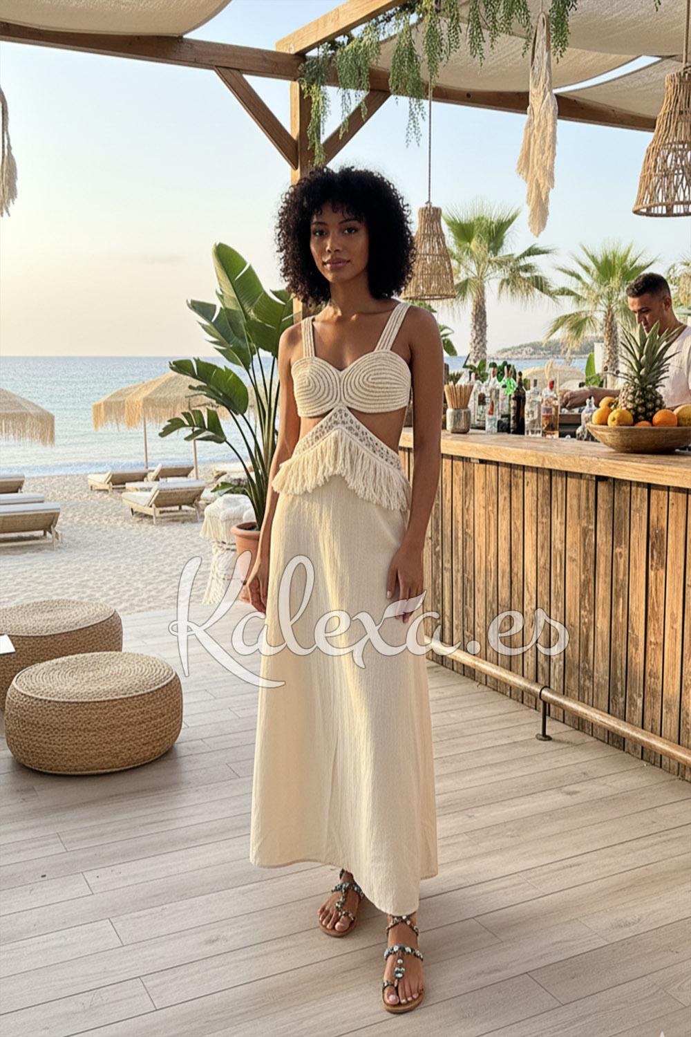 Vestido bohemio confeccionado en 100% algodón, con un exquisito detalle de macramé en el pecho y flecos en la cinturilla que aportan movimiento y un toque artesanal. La espalda al aire con tirantes para ajustar y la cremallera lateral realzan su silueta de forma cómoda y favorecedora.
