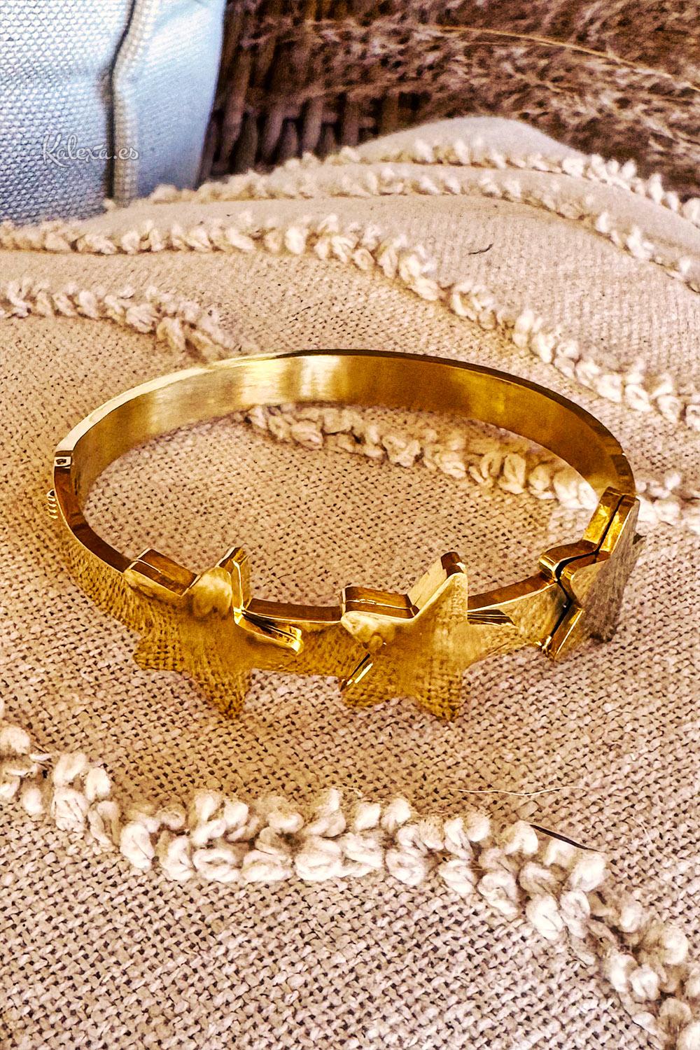 Forgé en acier inoxydable plaqué or, ce bracelet à trois étoiles rend hommage à la beauté du céleste et aux rêves qui nous guident. Chaque étoile représente une intention : ce que tu étais, ce que tu es et ce que tu es destinée à être.