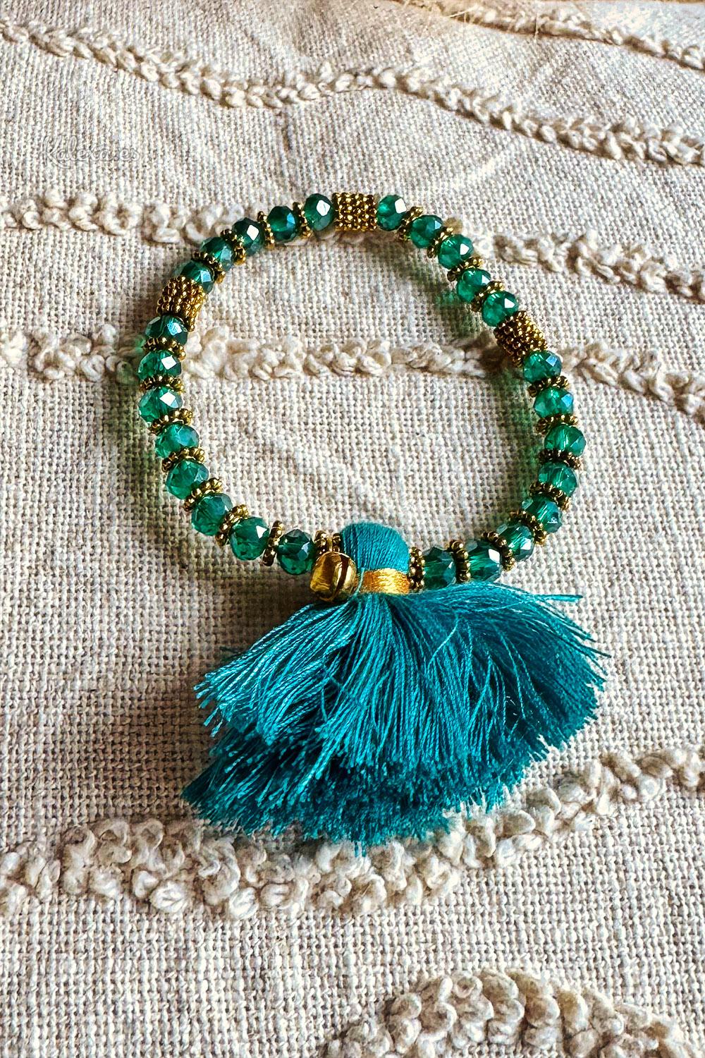 Bracelet boho chic élastique avec pierres, perles et pompon décoratif.