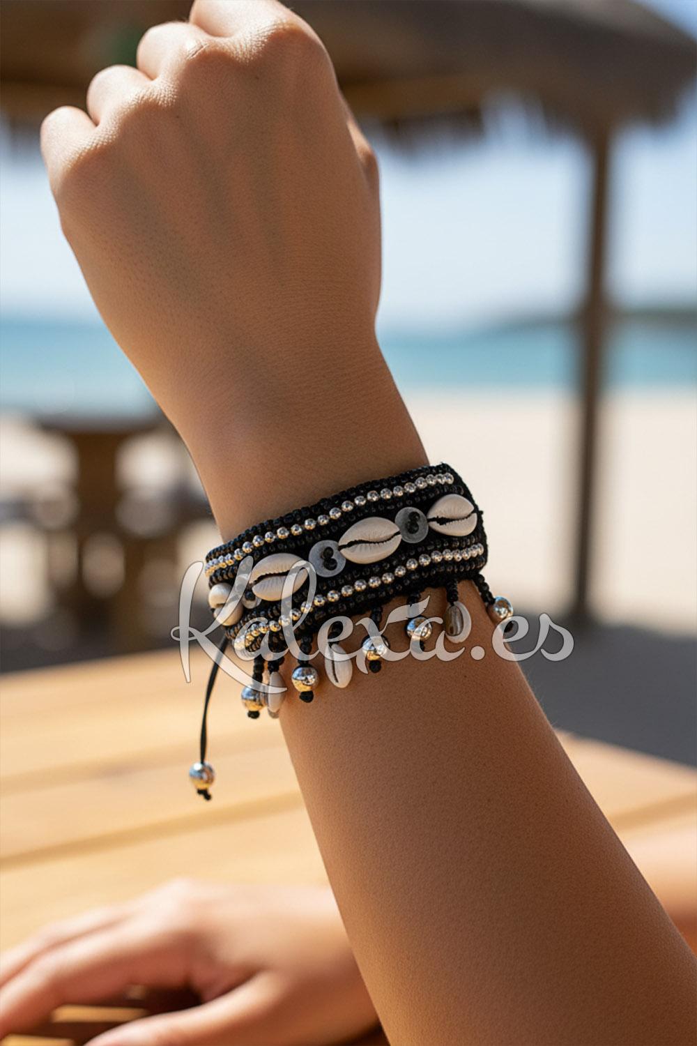 Bracelet artisanal en macramé avec fermoir ajustable, orné de perles et de coquillages naturels qui apportent une touche authentique et estivale.
