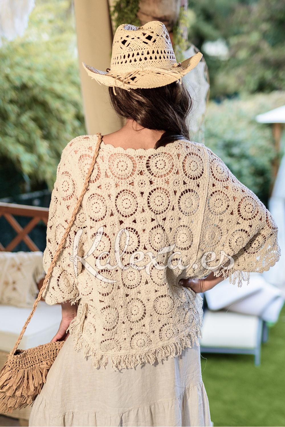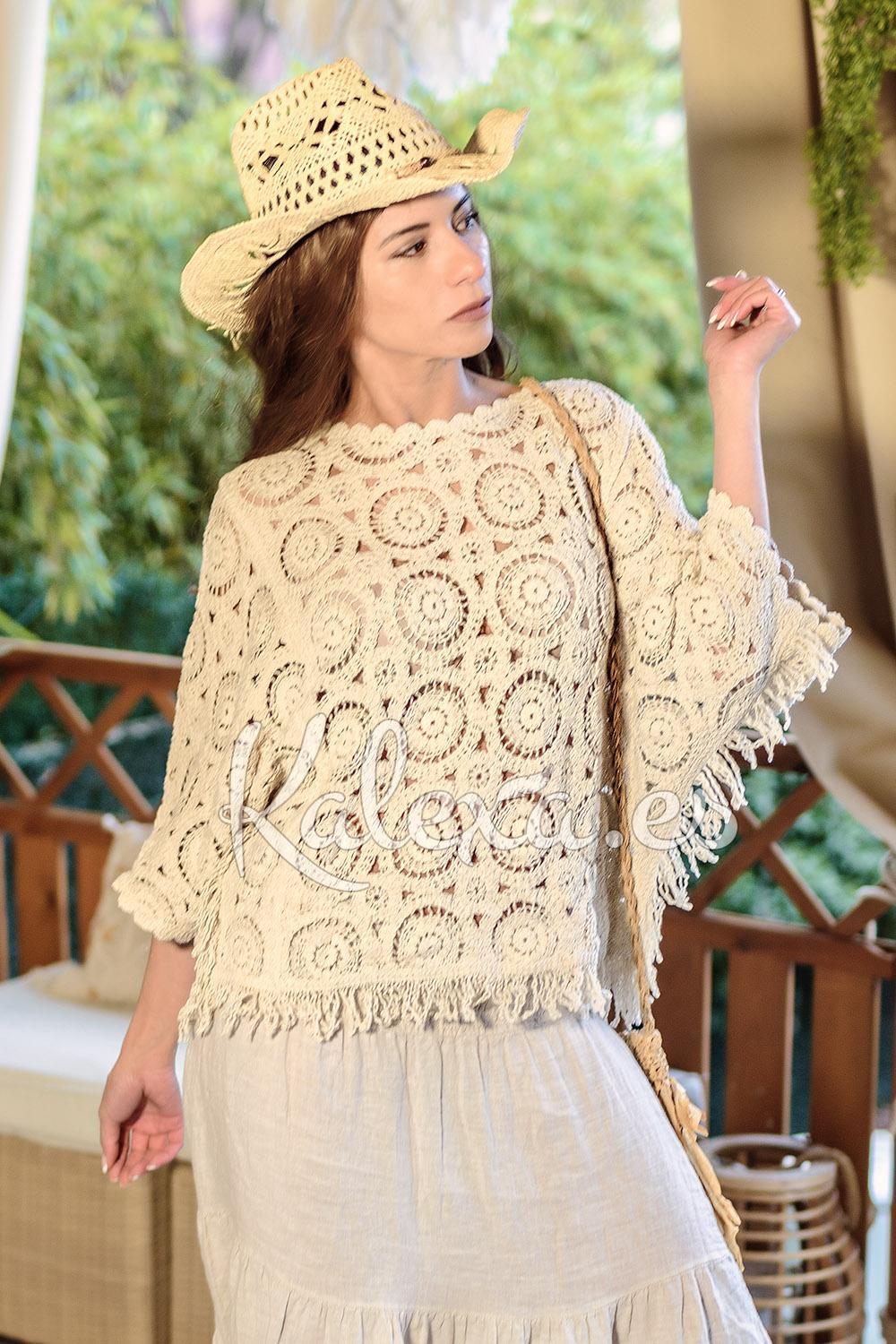 Haut crochet boho chic avec des manches de style poncho et des franges, un vêtement à l'esprit bohème, élégant et décontracté. Fait avec amour et 97% coton, 3% nylon.