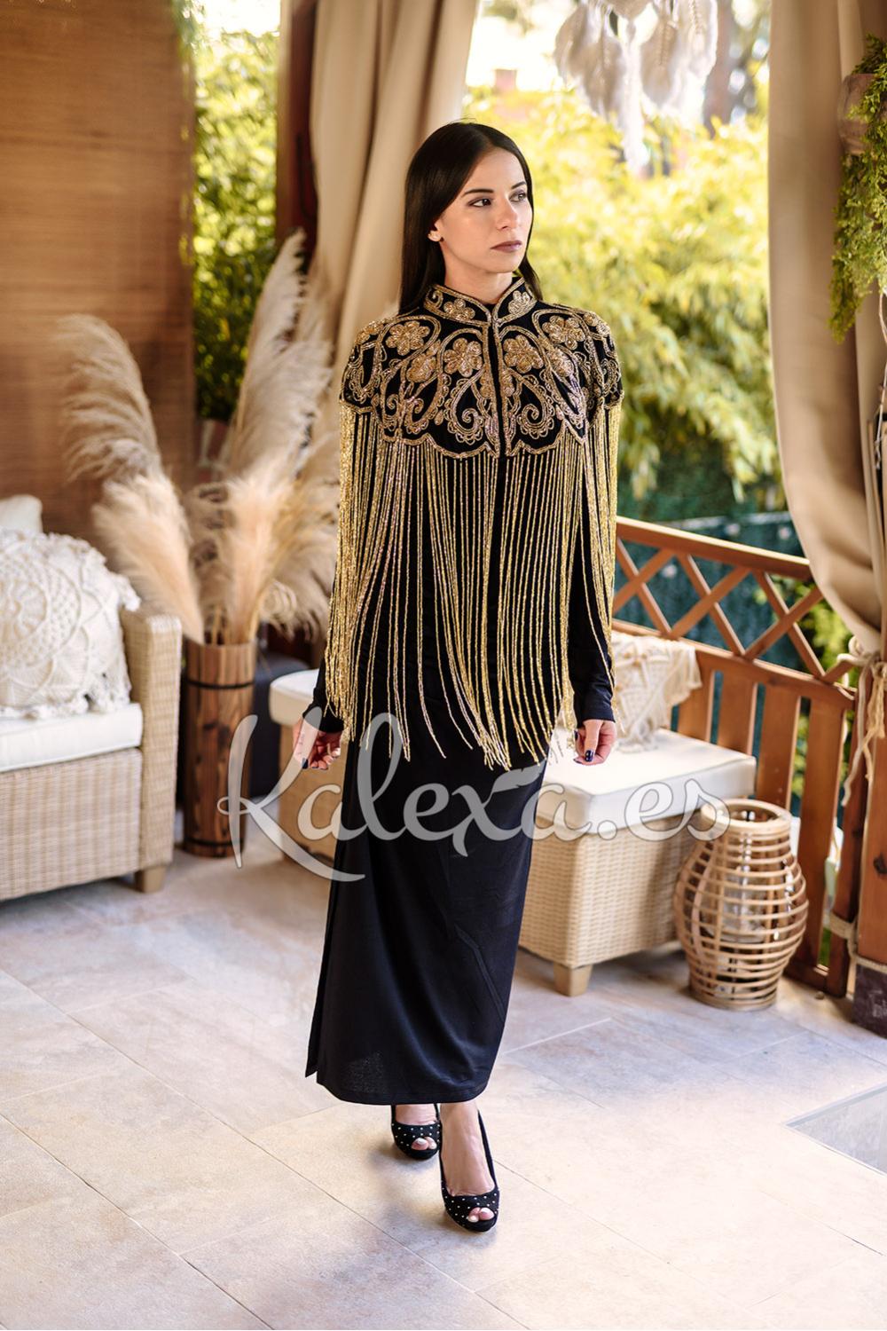 Cape en pierres précieuses avec broderies et applications de perles et paillettes, avec des franges en larmes. Dispose d'un col rond matelassé et d'une fermeture à ouverture bidirectionnelle (poncho ou cape). Idéal pour transformer n'importe quel look en un look plus élégant. Fabriqué à la main en Inde avec amour. Taille unique