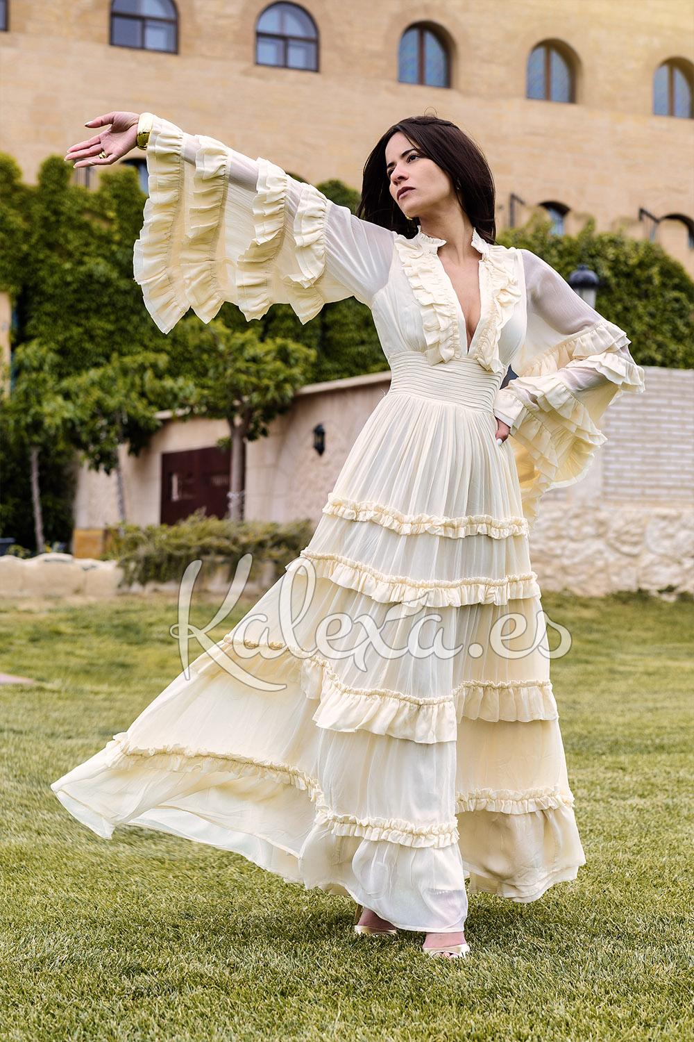 Robe de mariée boho chic avec des volants et des manches évasées assorties. Elle a un décolleté en V et une taille plissée marquée, avec de l'élastique à l'arrière pour un ajustement confortable et flatteur. Elle est doublée, se distingue par son vol spectaculaire et une chute légère qui apporte une ambiance romantique et aérienne. Idéale pour une mariée libre, féminine et au style unique. Fabriquée en Inde avec amour et 100% viscose. De la marque Diamond for Edén.