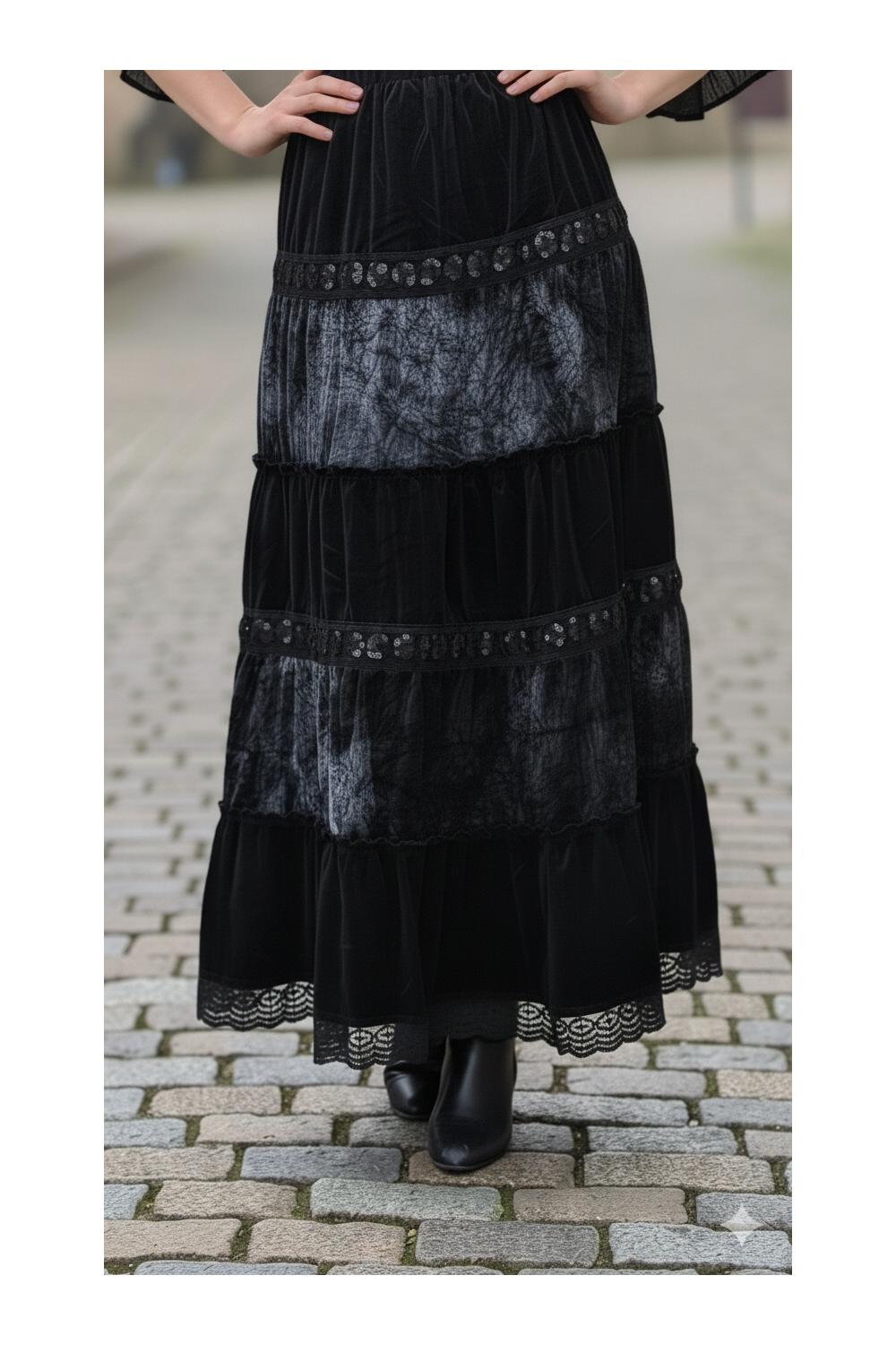 Jupe longue de style bohème avec un design à panneaux qui apporte mouvement et caractère à chaque pas. Son tissu effet velours côtelé lui donne une finition chaleureuse et spéciale, idéale pour les looks de mi-saison.