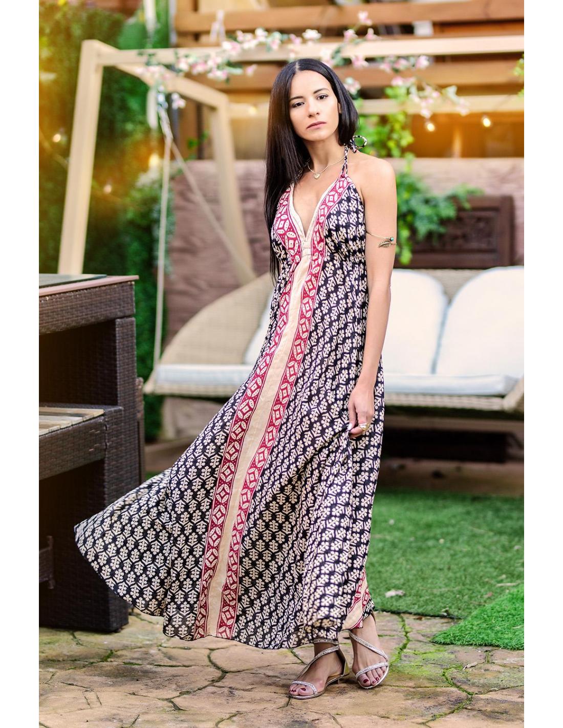 Robe bohème à motif ethnique, avec un décolleté en V avec bretelle ajustable et adaptable à la poitrine, à l'arrière, il y a aussi un cordon ajustable qui élance le dos. Élégante, flatteuse et sensuelle, c'est ainsi que cette robe se présente. Fabriquée en Inde avec amour et 100% coton.