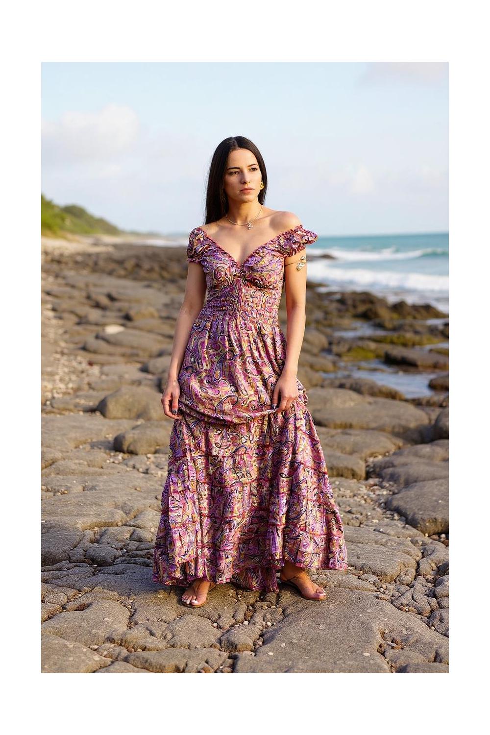 Cette robe boho chic allie élégance et style décontracté grâce à son imprimé avec des touches dorées qui apportent une brillance subtile et sophistiquée. La taille élastique en nid d'abeille s'adapte doucement au corps, mettant en valeur la silhouette avec un grand confort.