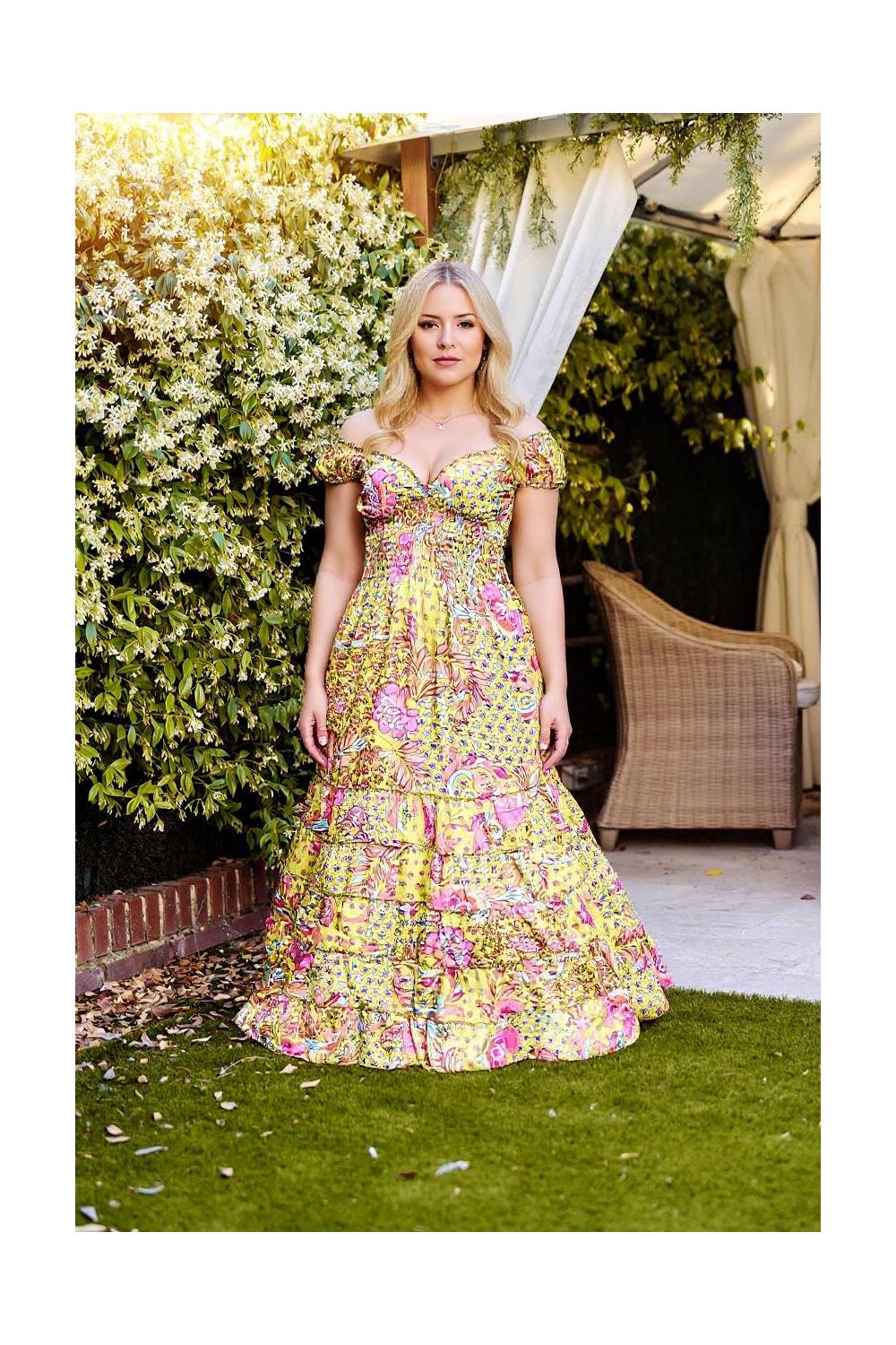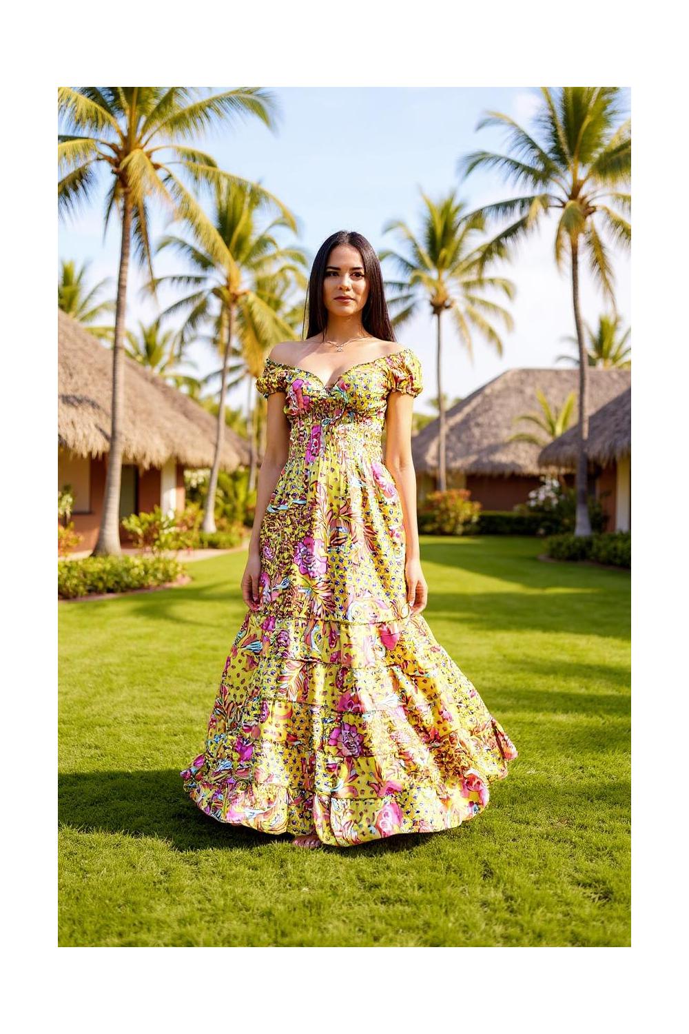 Cette robe boho chic brille avec son imprimé vibrant rehaussé de touches dorées qui captent la lumière avec élégance. Sa taille élastique de type nid d'abeille s'adapte confortablement à la silhouette, tandis que le décolleté croisé en V ajustable permet de l'ajuster à votre goût, ajoutant une touche féminine et flatteuse.
