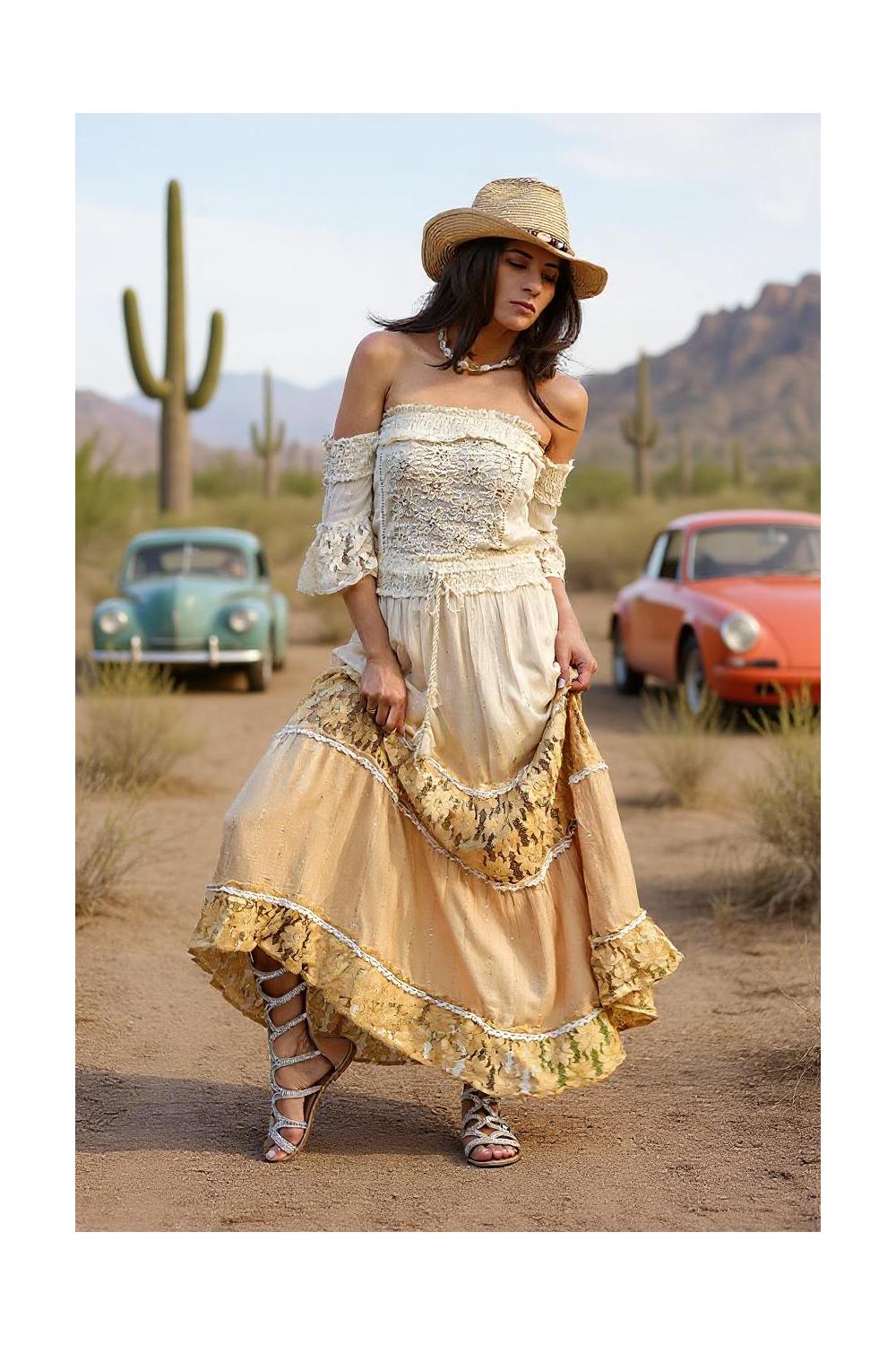Cette robe bohème est pure poésie en mouvement. Son dégradé délicat du beige au camel évoque la chaleur de la terre et les couchers de soleil dorés. Confectionnée dans un tissu léger parsemé de petites paillettes, elle dégage un éclat discret et charmant qui illumine chaque pas.