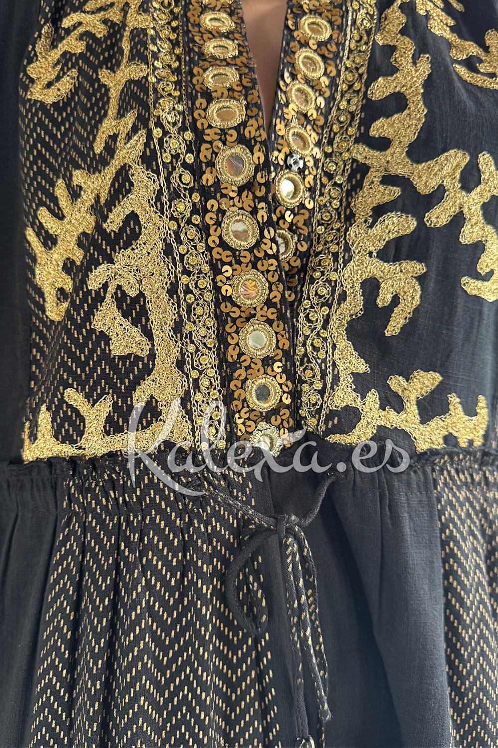 Robe en coton doux avec une subtile gravure dorée qui apporte de la lumière et de l'élégance. Présente un col mao avec une fermeture à clip et une décoration artisanale avec des broderies, des perles et de petits miroirs qui rehaussent son charme bohème.